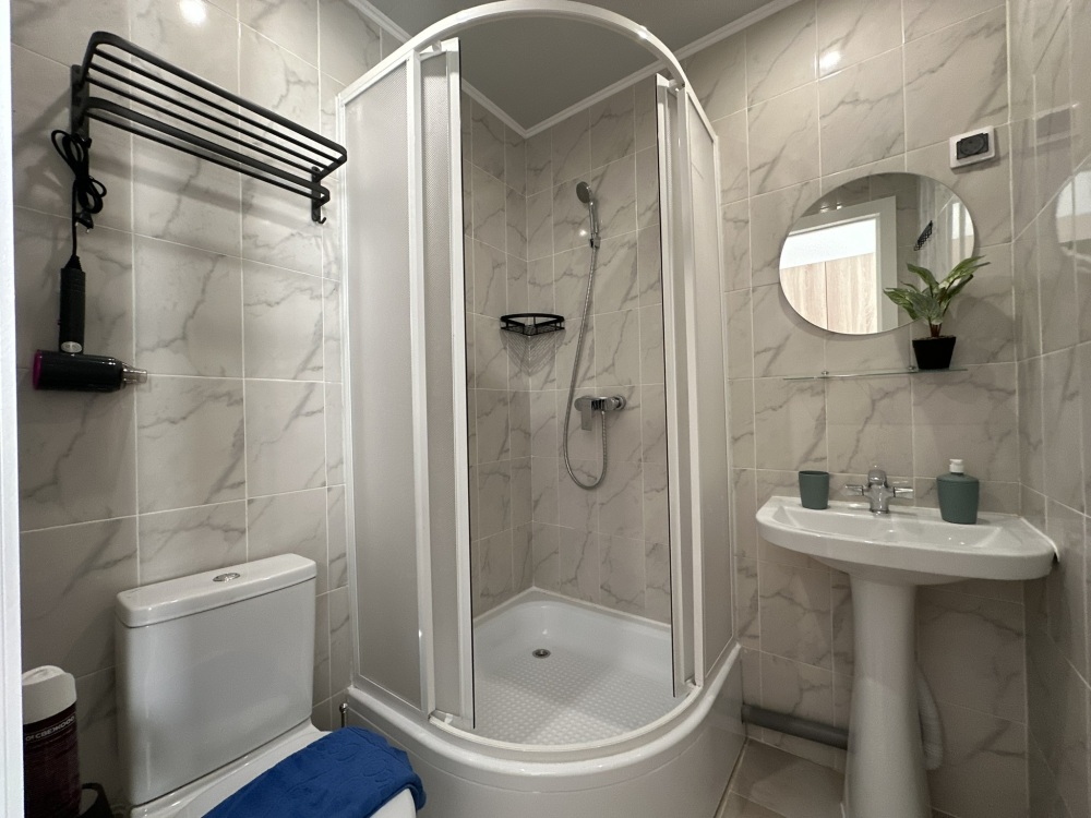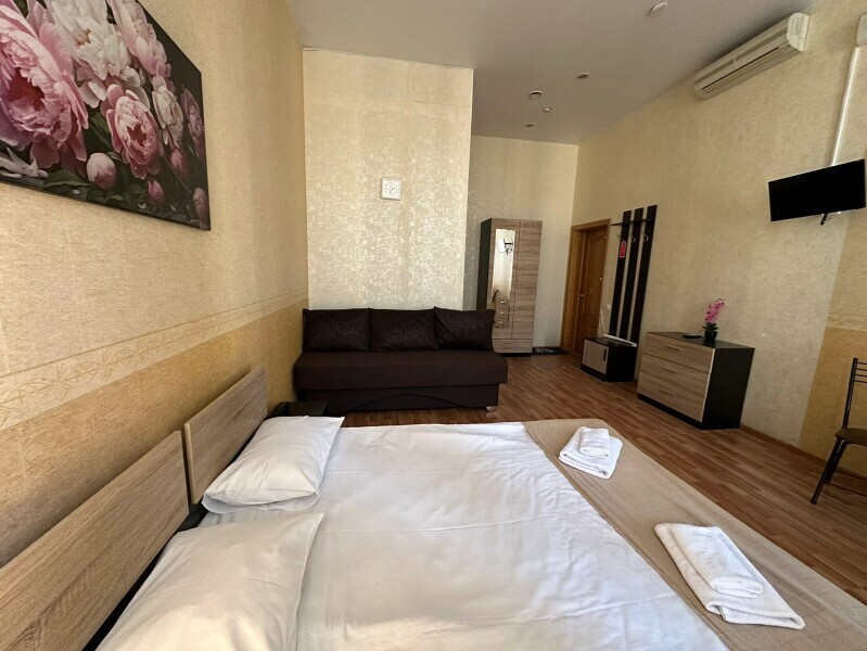 Трехместный номер с двуспальной кроватью и диваном, оборудованный всем необходимым для комфортного проживания, ЖК телевизор, собственная ванная комната с душевой кабиной, раковиной и туалетом. Гостям предоставляется постельное белье, полотенца, доступ к интернету.