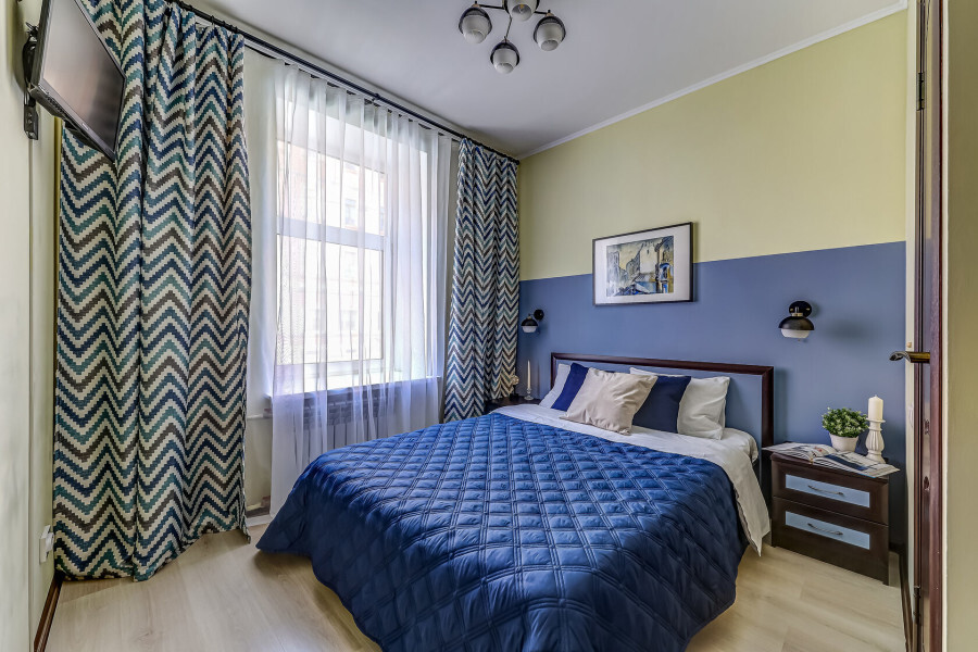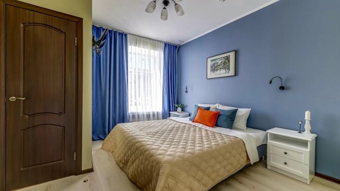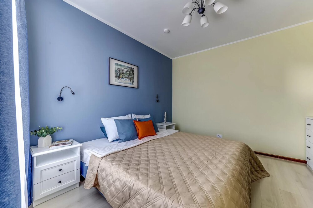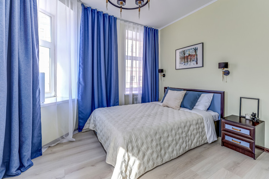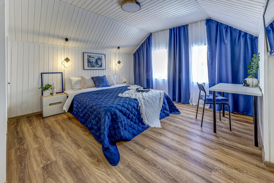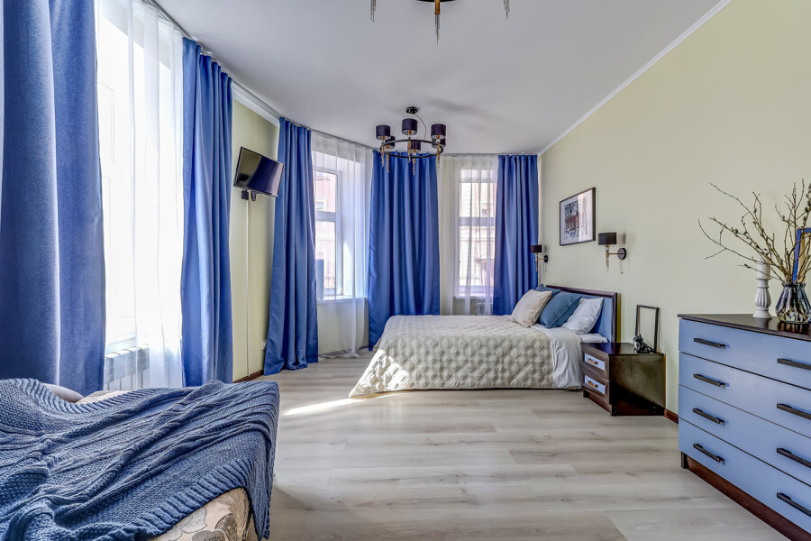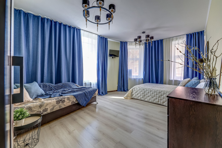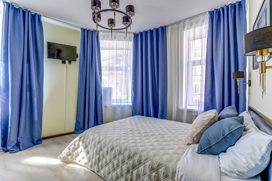В номере собственный санузел с ванной, ТВ в спальне и гостиной, тумбы с ящиками, шкаф для одежды, плотные шторы, рабочий стол, фен, гладильные принадлежности, кондиционер.