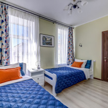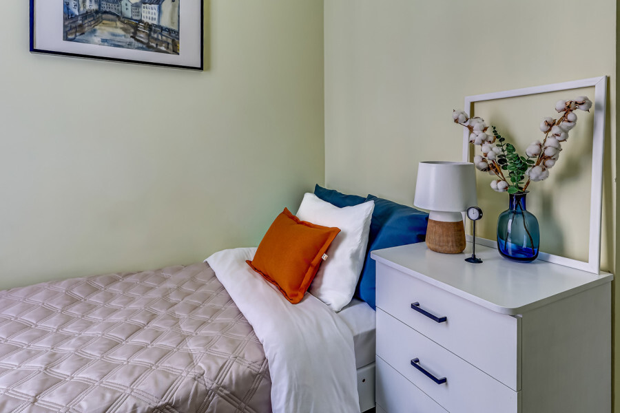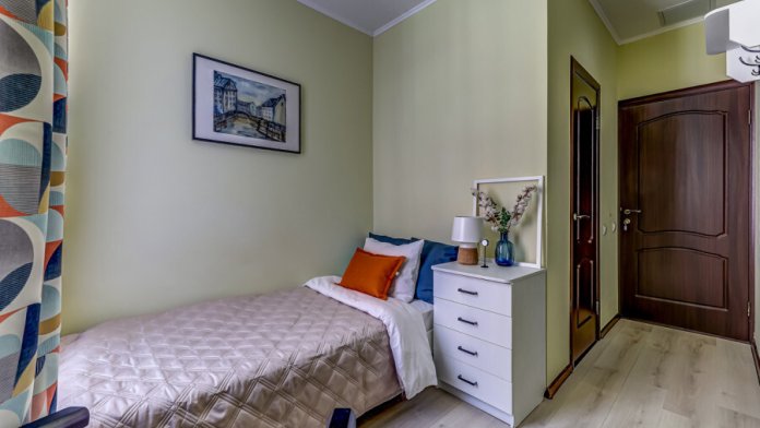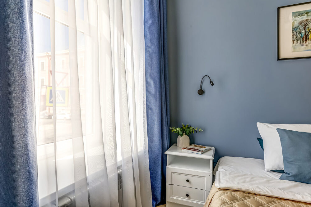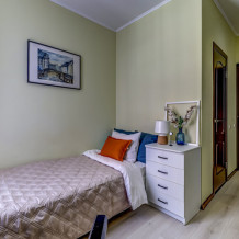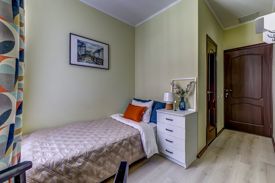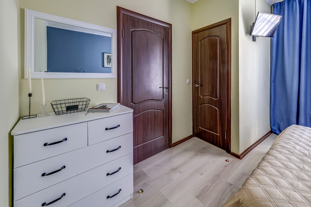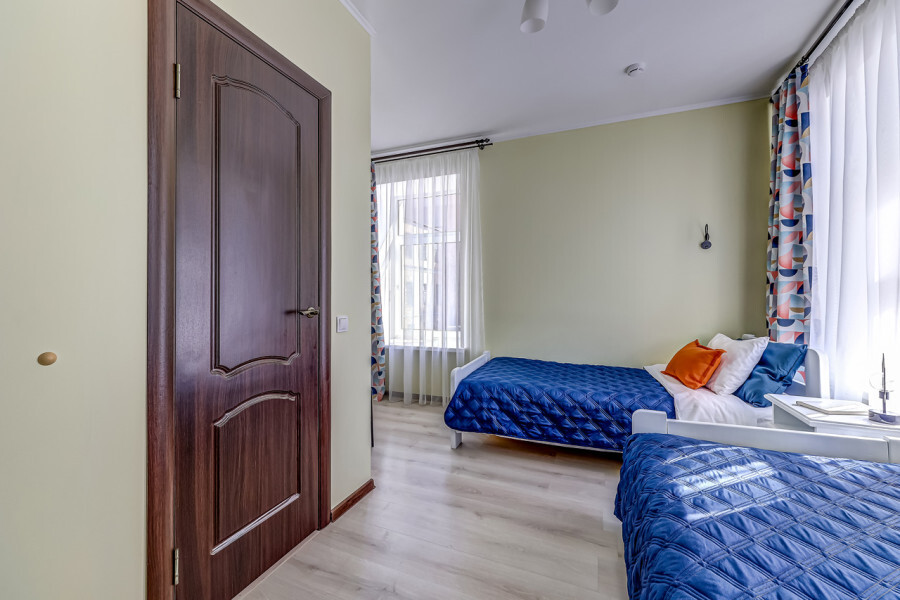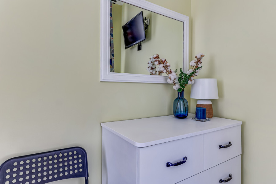 В номере собственный санузел, ТВ, большой комод, индивидуальные для каждого гостя тумбы с ящиками, плотные шторы и большое зеркало.