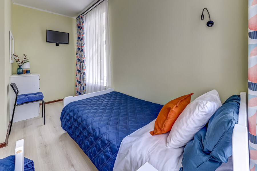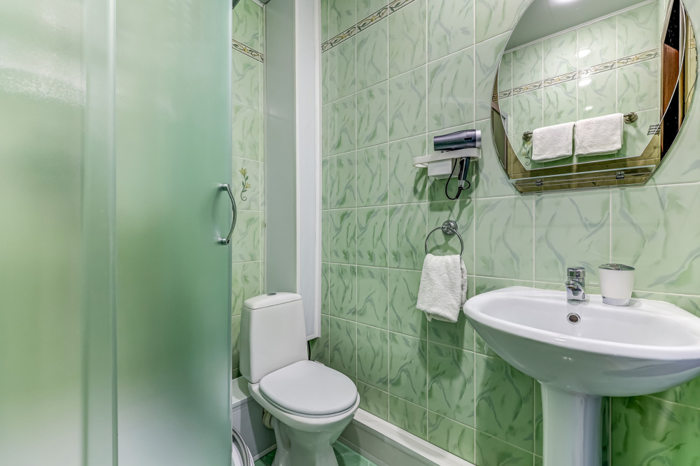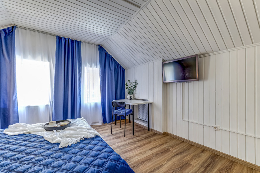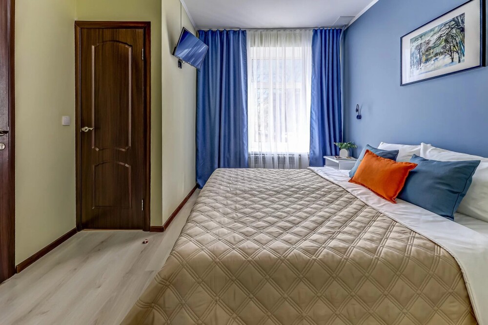 В номере собственный санузел, ТВ, тумбы с ящиками, шкаф для одежды с зеркалом, плотные шторы, фен.