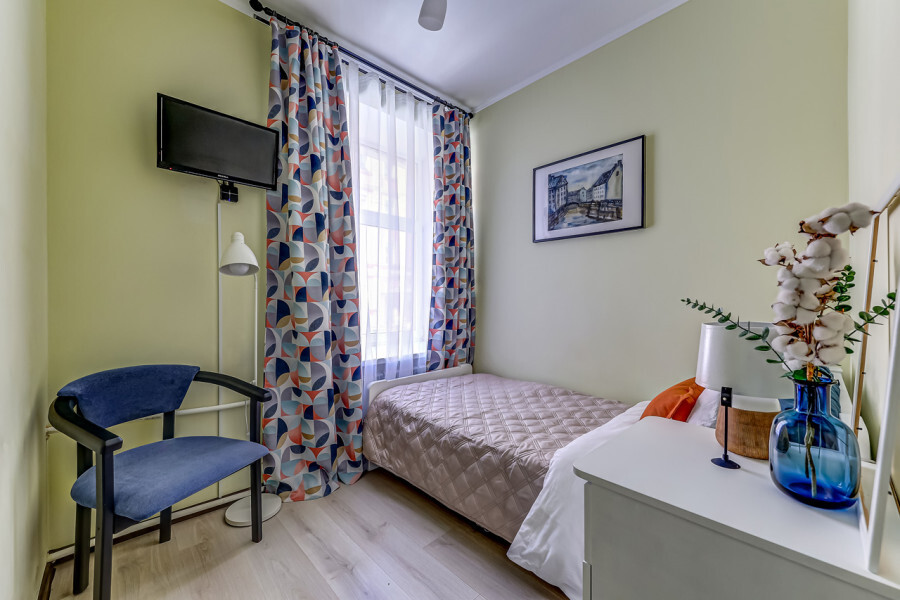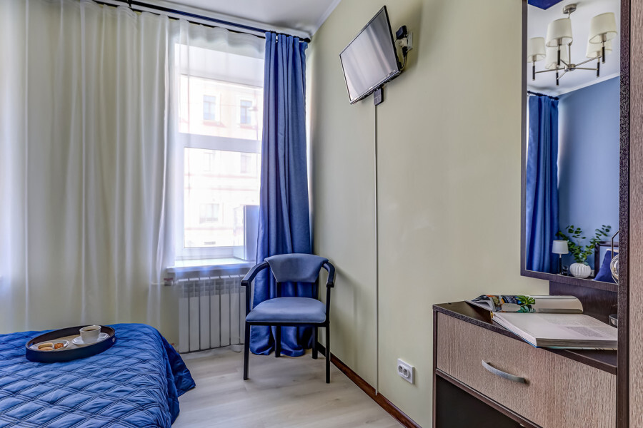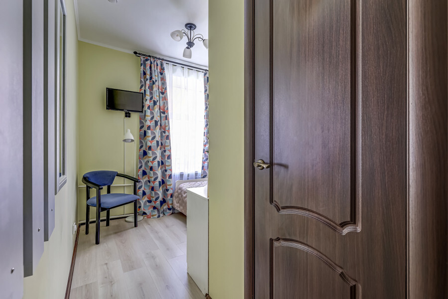 В номере собственный санузел, ТВ, тумба с ящиками, вешалка-прихожая, плотные шторы, полукресло, уютный торшер и большое зеркало.