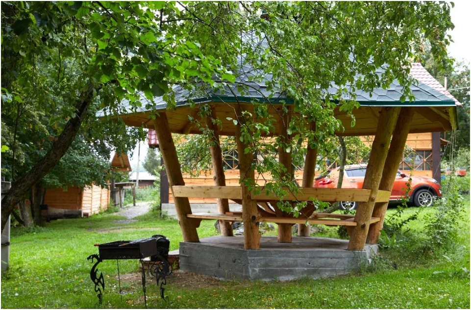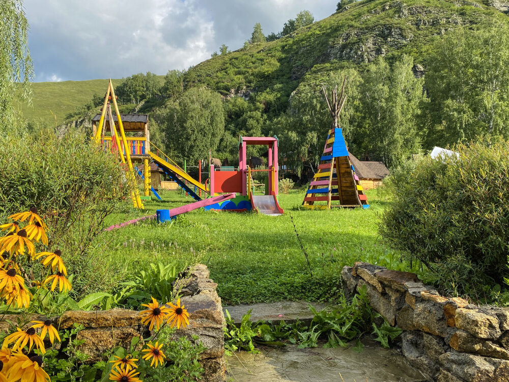 На просторной зеленой территории гости чувствуют себя комфортно и безопасно, здесь нет тесноты и шума. Радуют глаз цветники, возле каждого домика есть ягодный куст – смородина, жимолость, клубника, земляника – в свободном доступе для гостей. Красивый пруд в виде раскинувшего крылья сокола, и два бассейна предоставляют возможность для купания. Удобная лестница ведет к обзорной беседке на скале, откуда открывается чудесный вид. В небольшом дендрарии можно найти редкие и целебные растения Сибири и Дальнего Востока. Фруктовый сад на территории – яблони, груши, сливы, вишня.