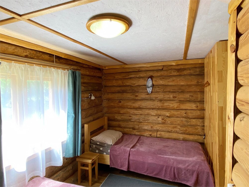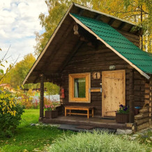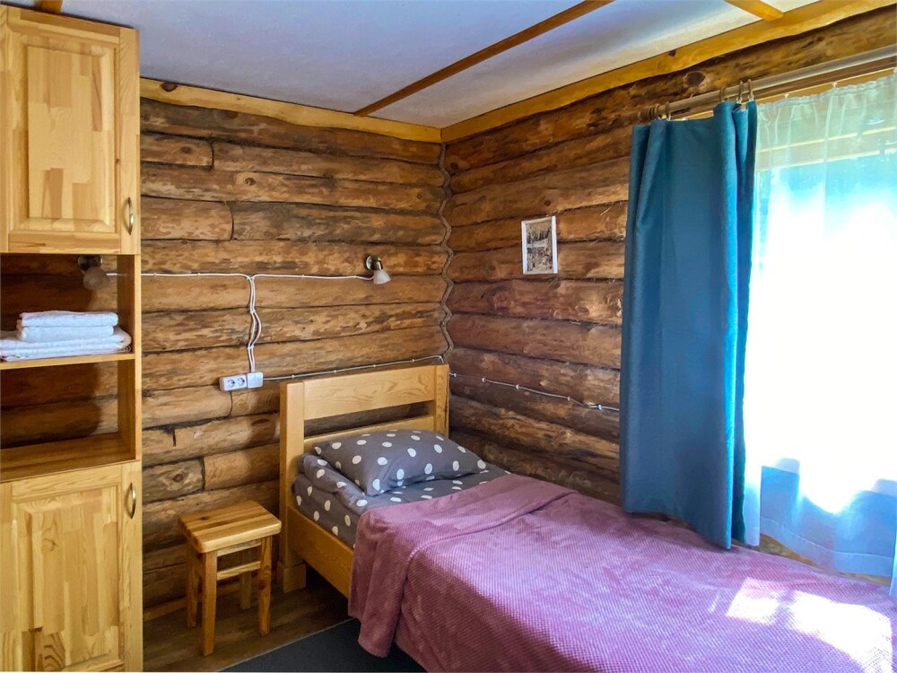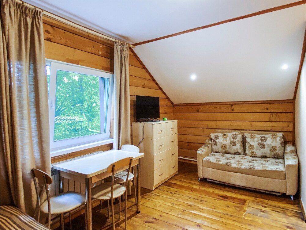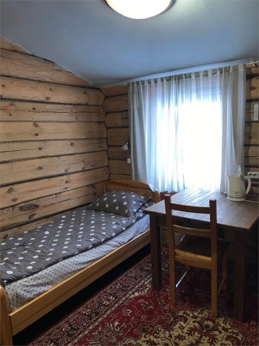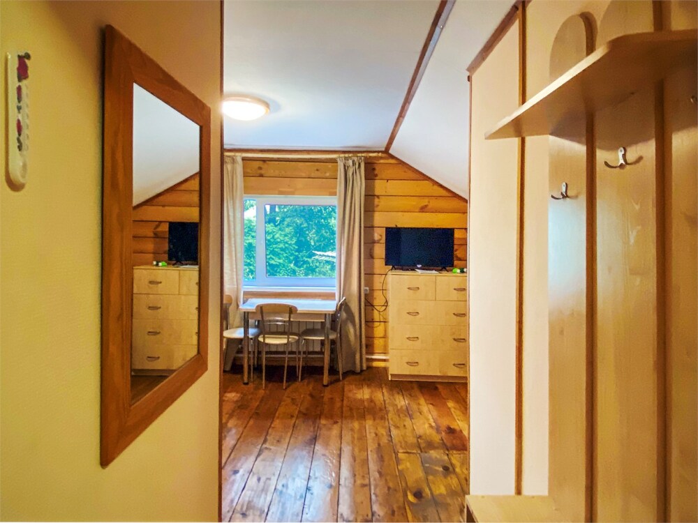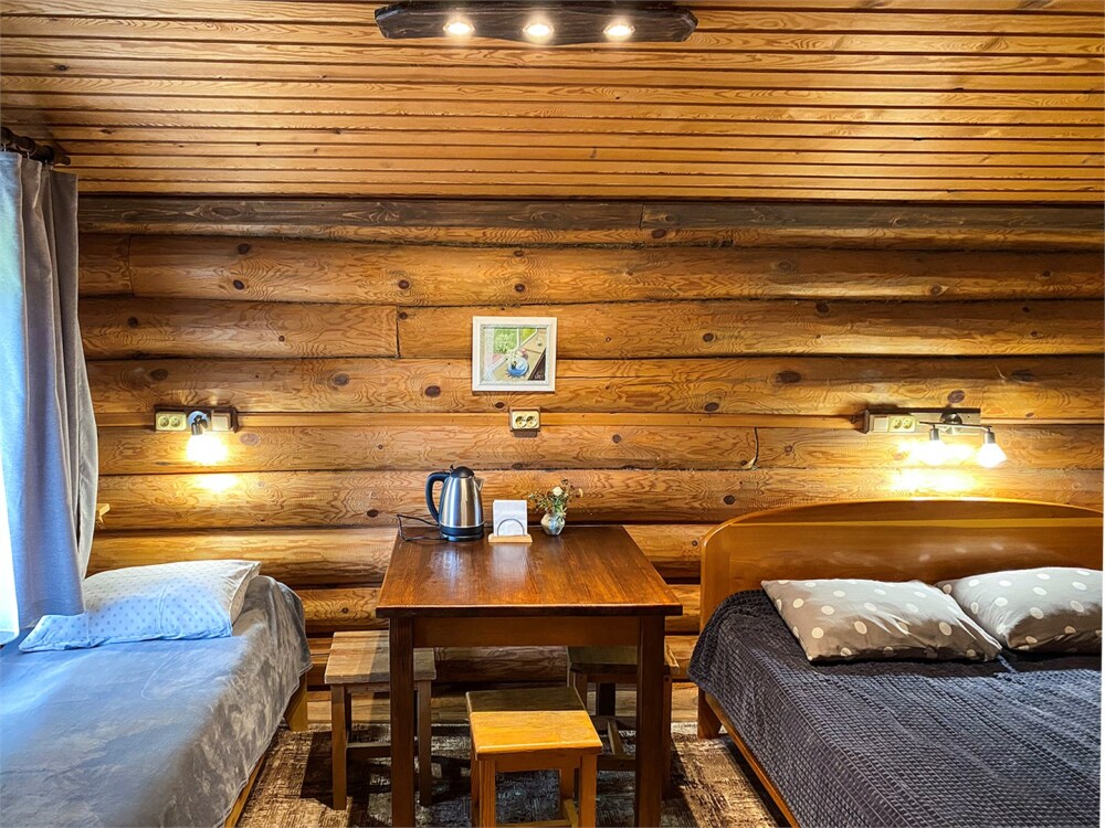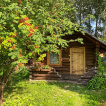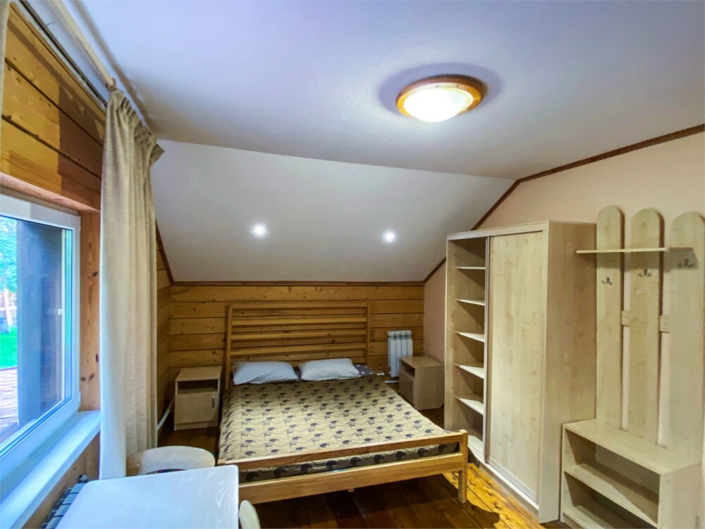 Двухэтажный дом из дерева, 1 этаж - отдельный вход. Маленькая терраса. Две односпальные кровати, двуспальный диван, стол, стулья, холодильник, чайник, набор посуды. Душ, туалет. Комплект полотенец.