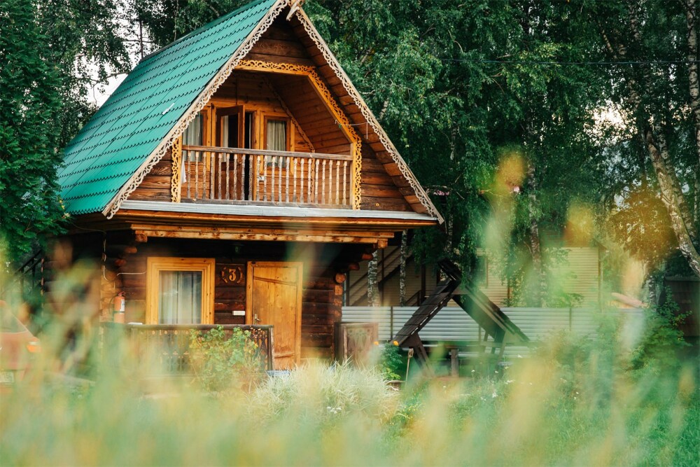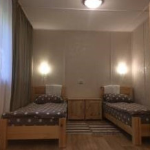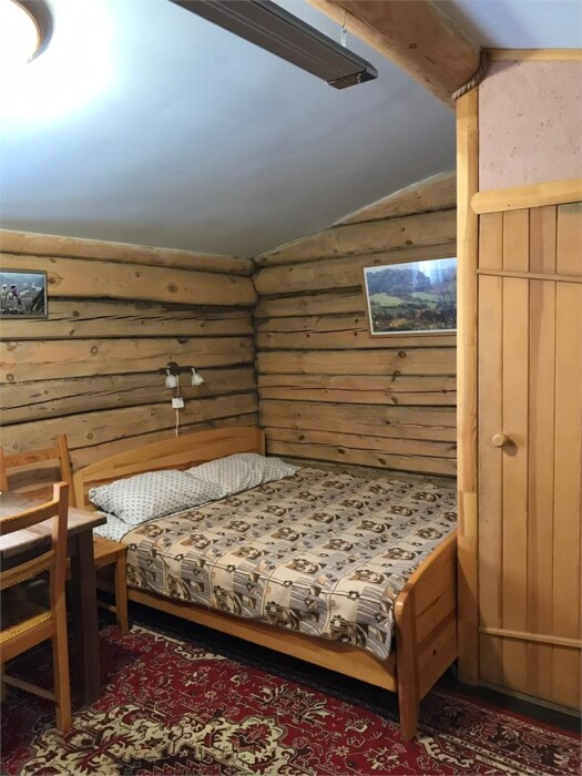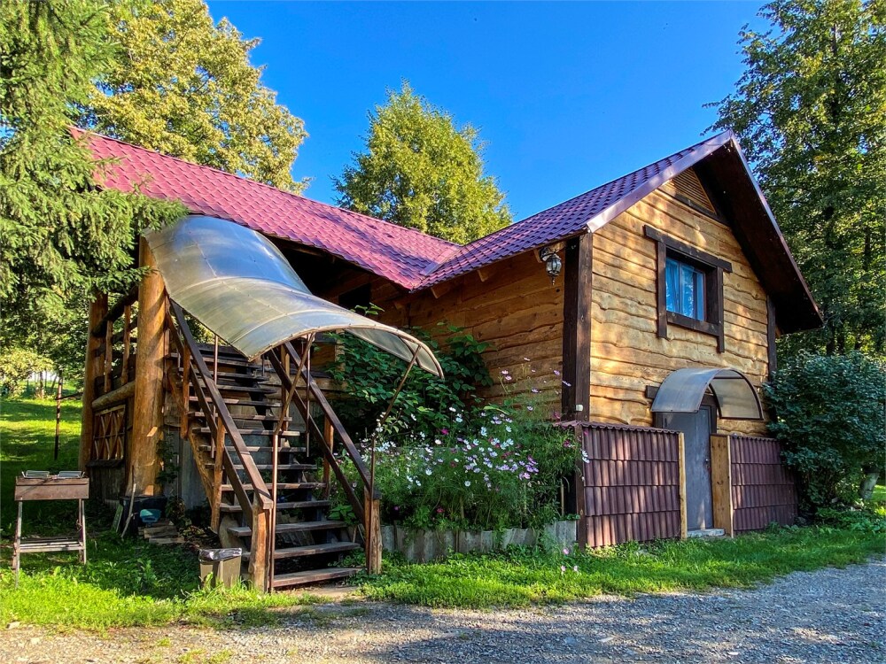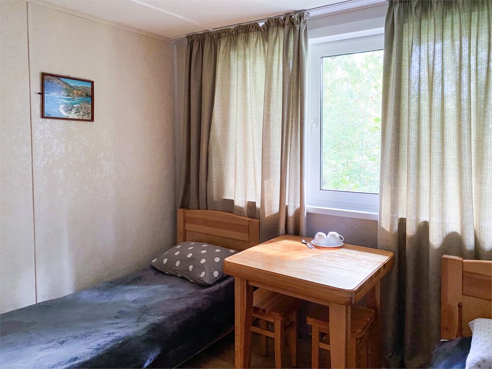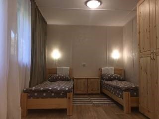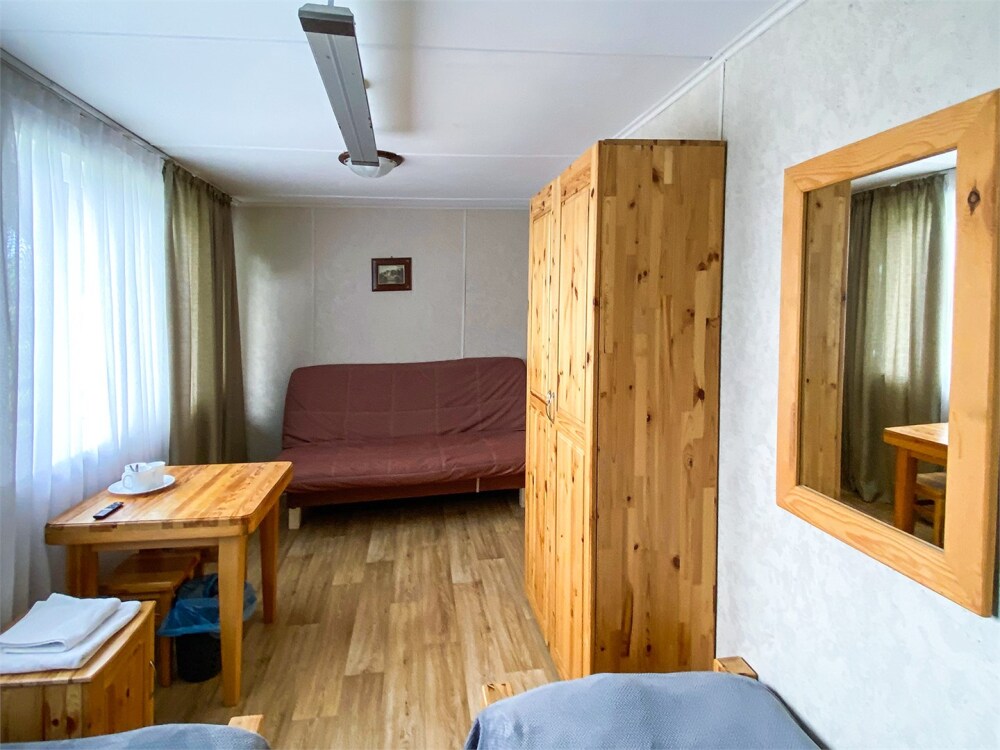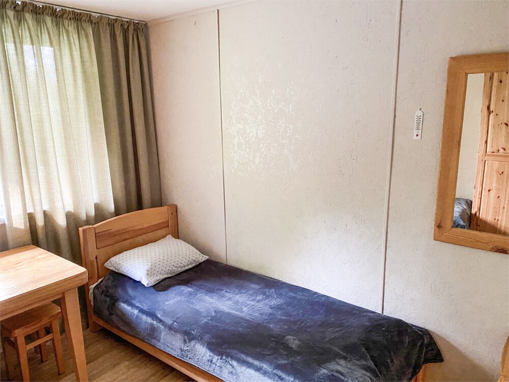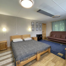Двухэтажный дом из дерева, 1 этаж - отдельный вход. Маленькая терраса. Две односпальные кровати, двуспальный диван, стол, стулья, холодильник, чайник, набор посуды. Душ, туалет. Комплект полотенец.