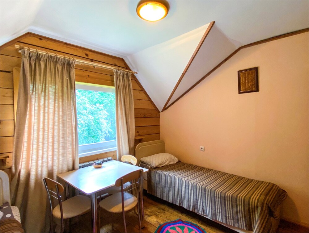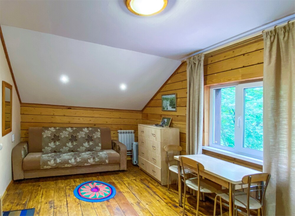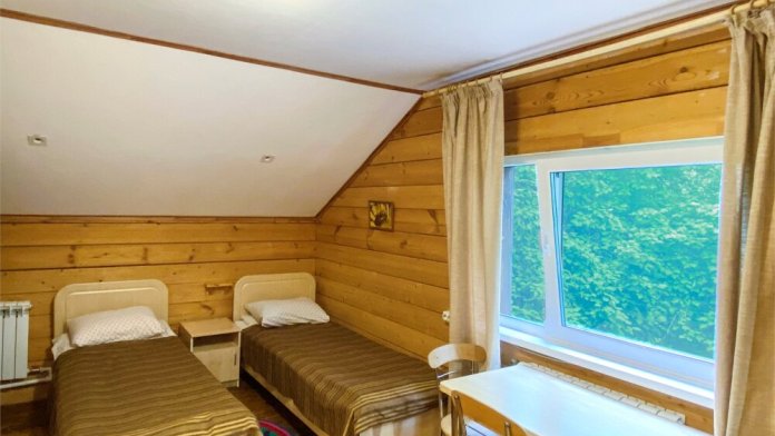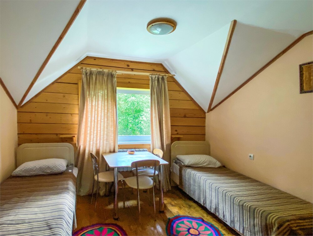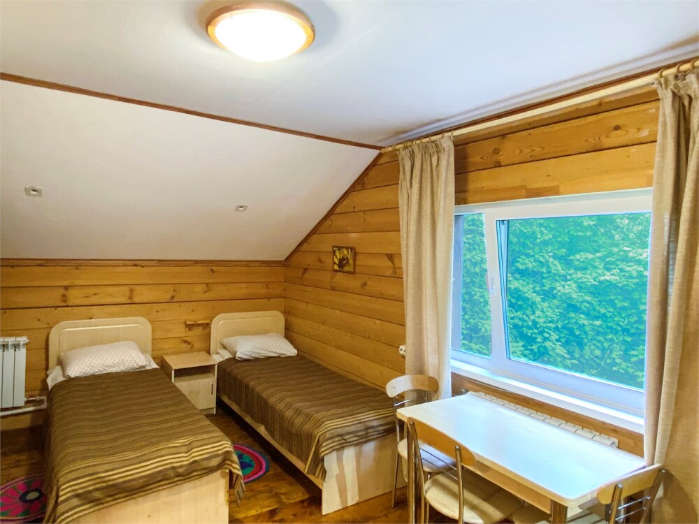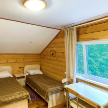 Двухэтажный дом из дерева. 2 этаж, комната с балконом - вид на гору: две односпальные кровати, диван, комплект полотенец. Стол, стулья, гардеробная зона. Кухонная зона на 3 номера (кухонный шкафчик, раковина, эл. чайник, мини-холодильник), санузел на 3 номера (душ, унитаз, раковина, зеркало, водонагреватель, г/х вода, туалетные средства).