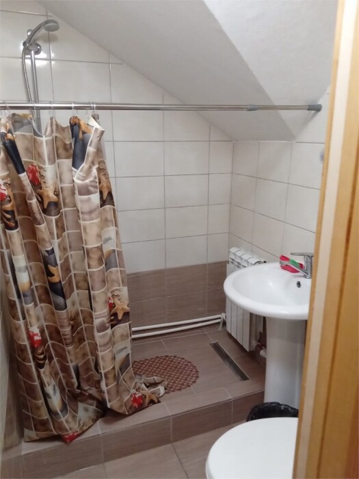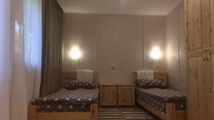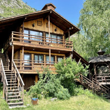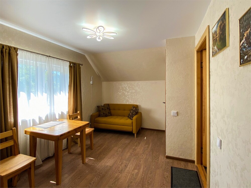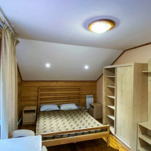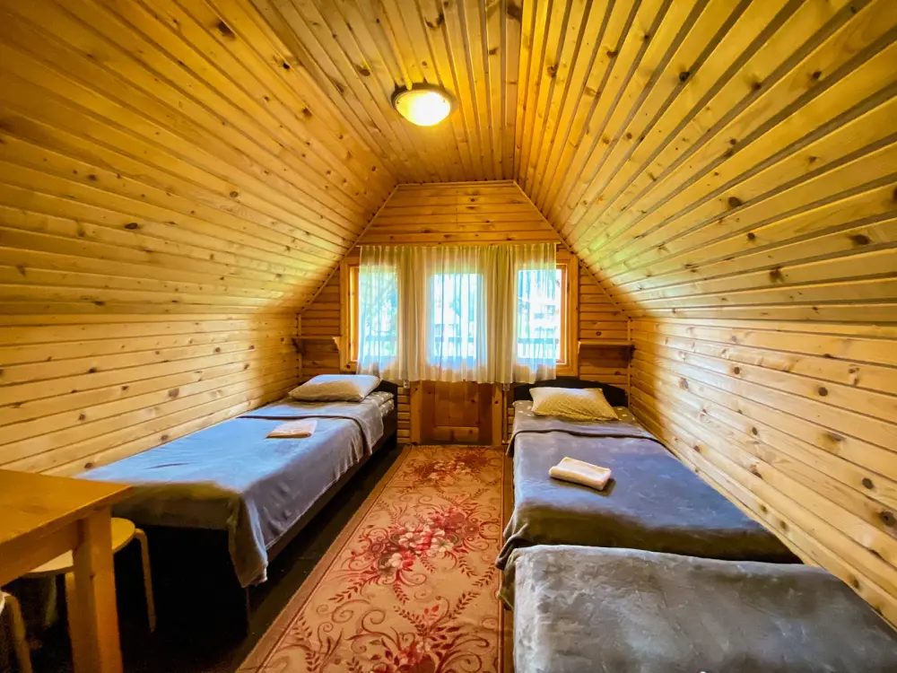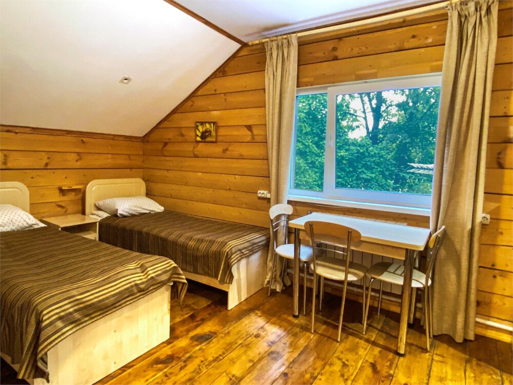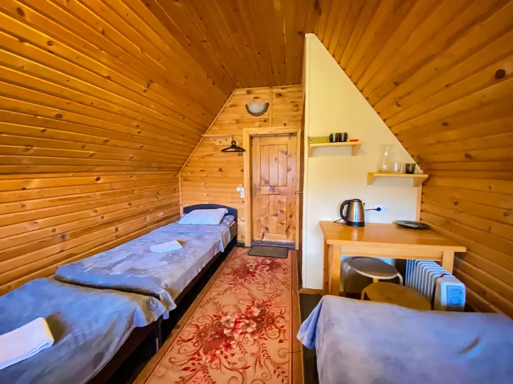 Двухэтажный дом из дерева. 2 этаж, комната с балконом - вид на гору: две односпальные кровати, диван, комплект полотенец. Стол, стулья, гардеробная зона. Кухонная зона на 3 номера (кухонный шкафчик, раковина, эл. чайник, мини-холодильник), санузел на 3 номера (душ, унитаз, раковина, зеркало, водонагреватель, г/х вода, туалетные средства).