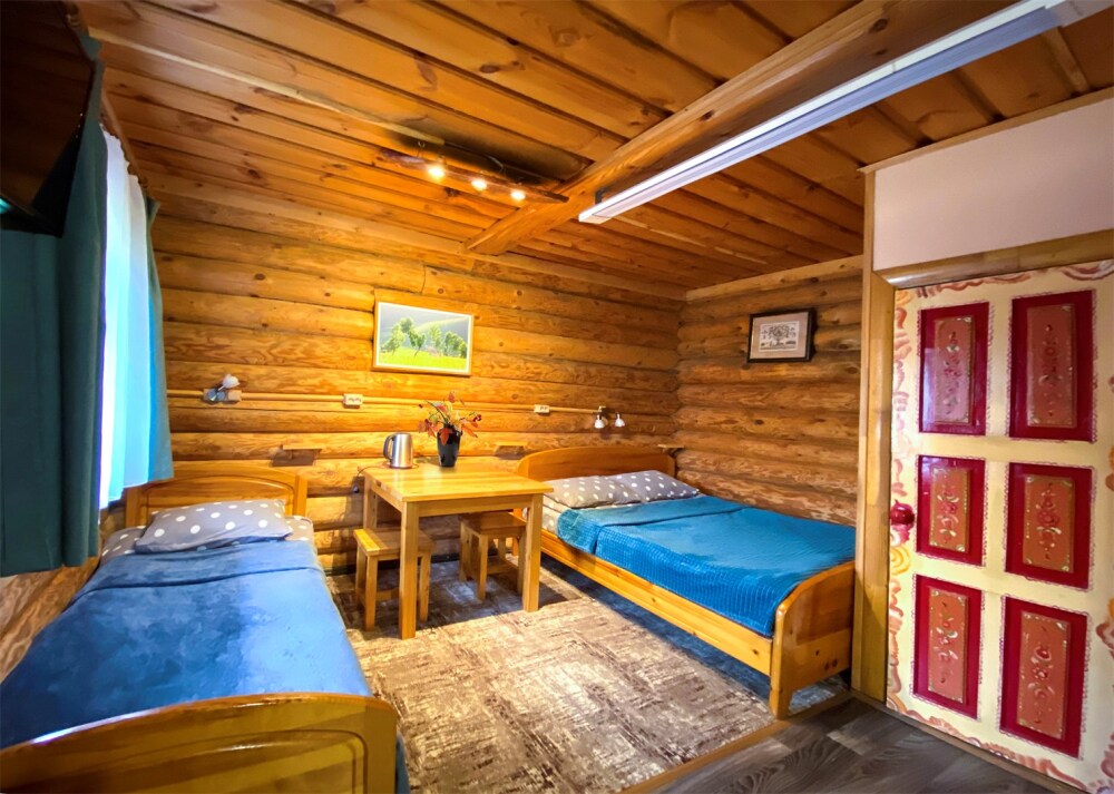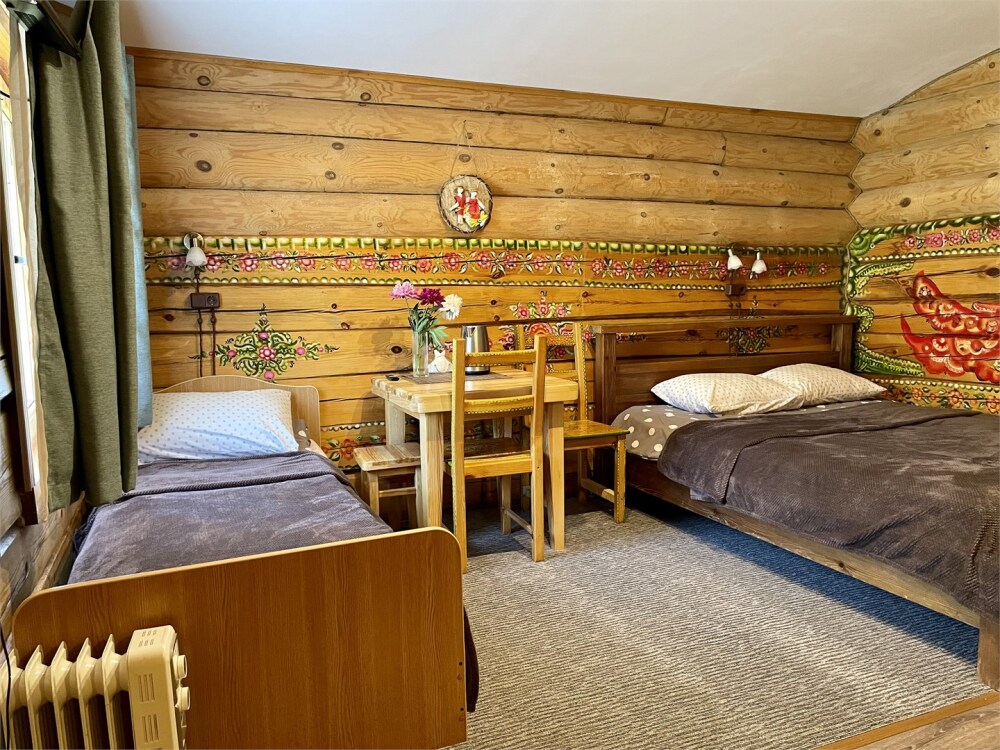 Двухэтажный дом из дерева. 2 этаж, две односпальные кровати, комплект полотенец. Стол, стулья, гардеробная зона.