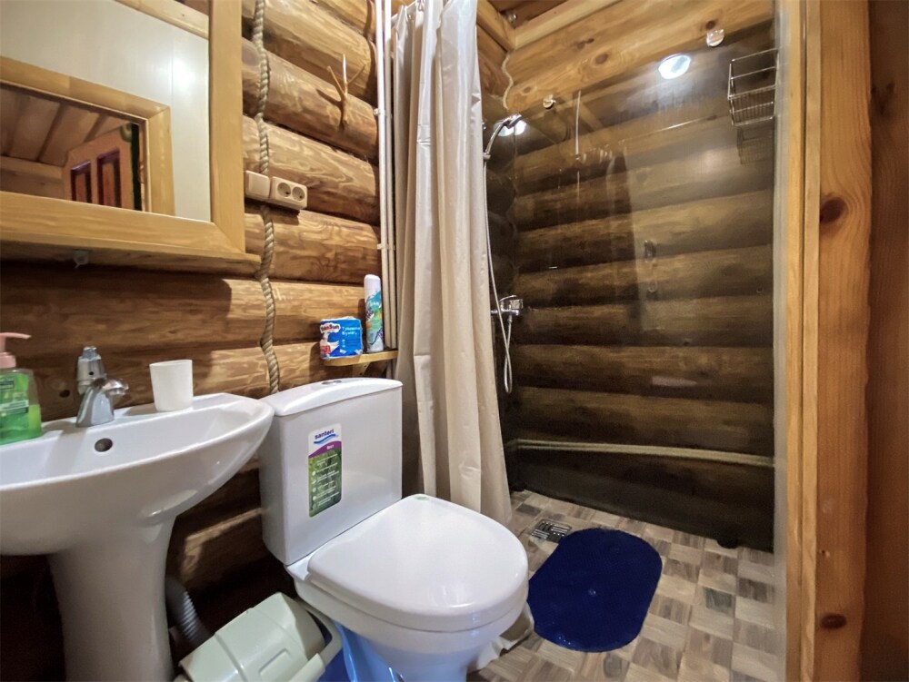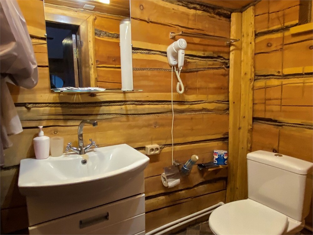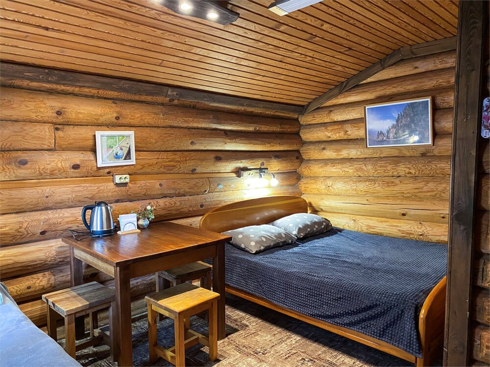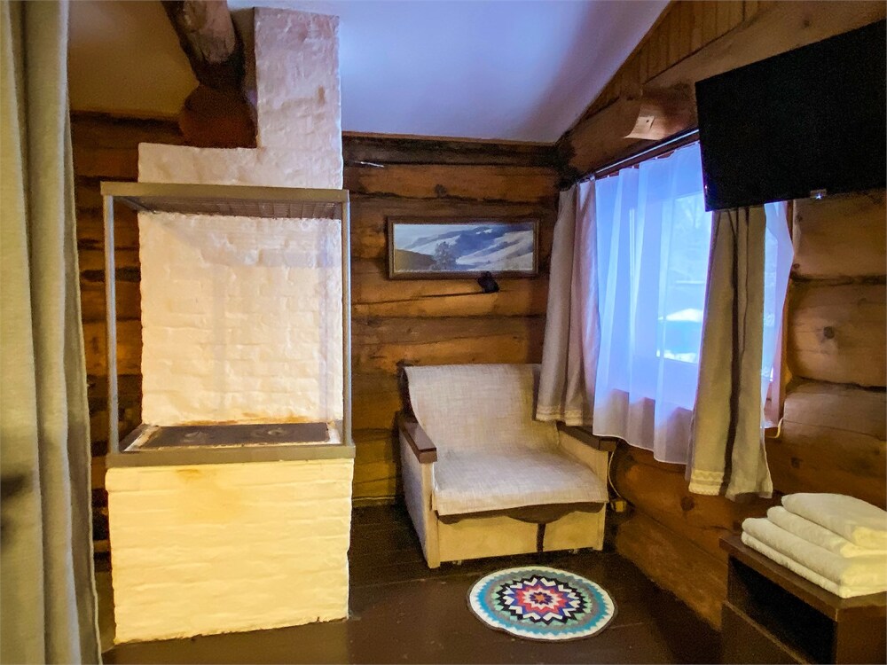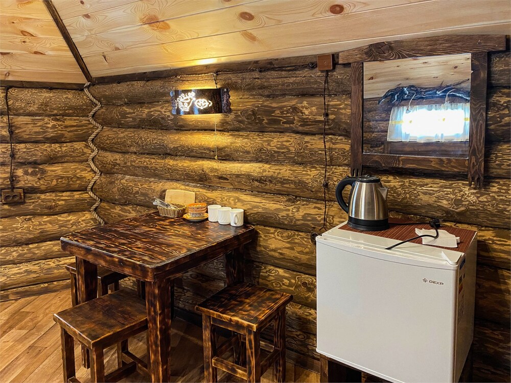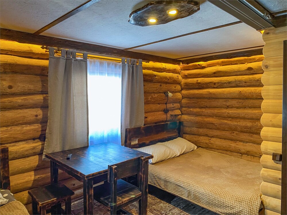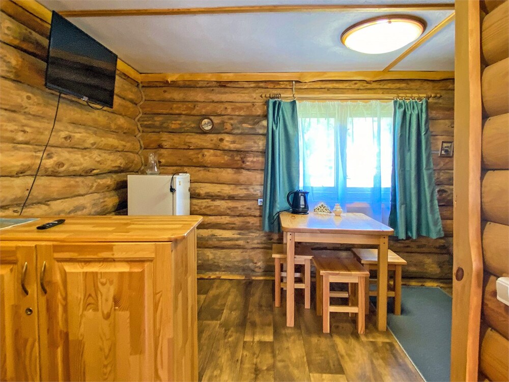 Бревенчатый отдельно стоящий дом из кедра, настоящая печка. Двуспальная евро-кровать, кресло-кровать. Шкаф для одежды, обеденная зона, холодильник, СВЧ-печь, чайник, набор посуды, TV. Душ/туалет, фен, теплый пол. Комплект полотенец.