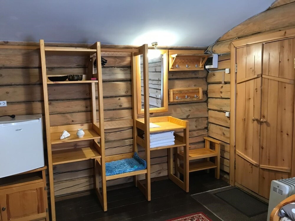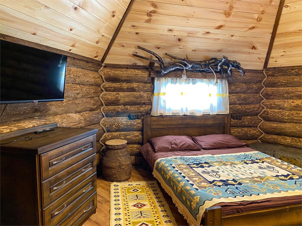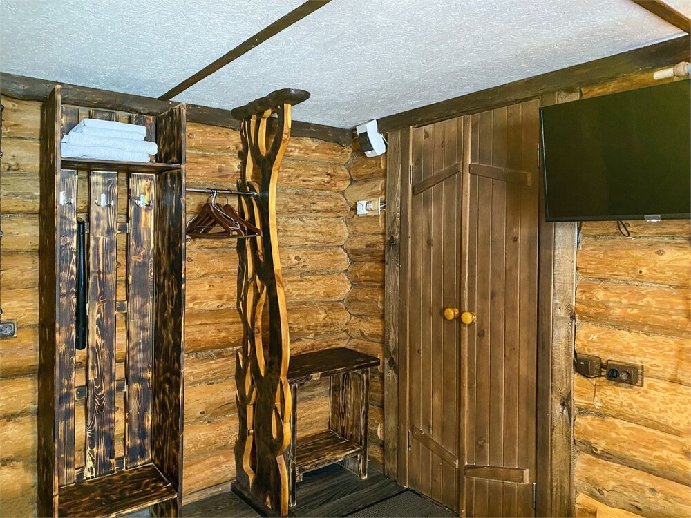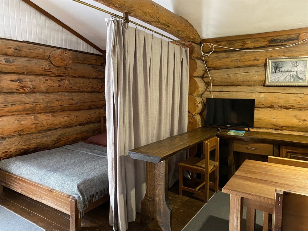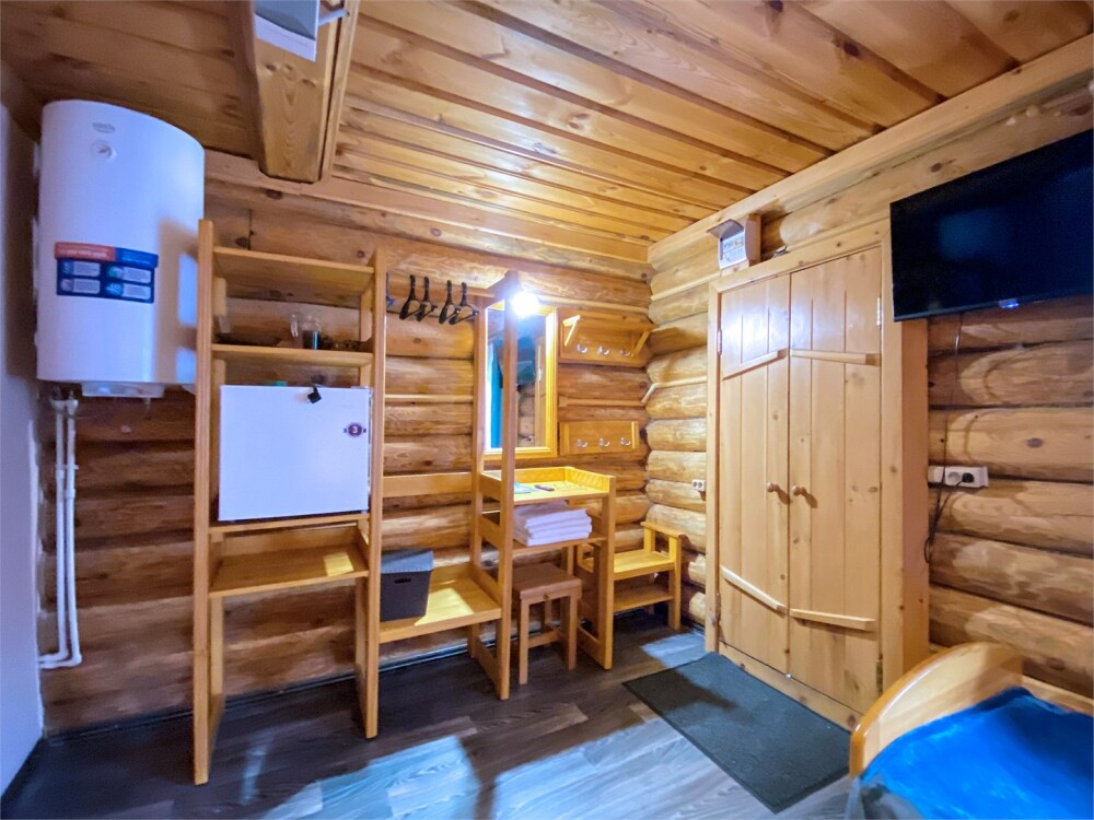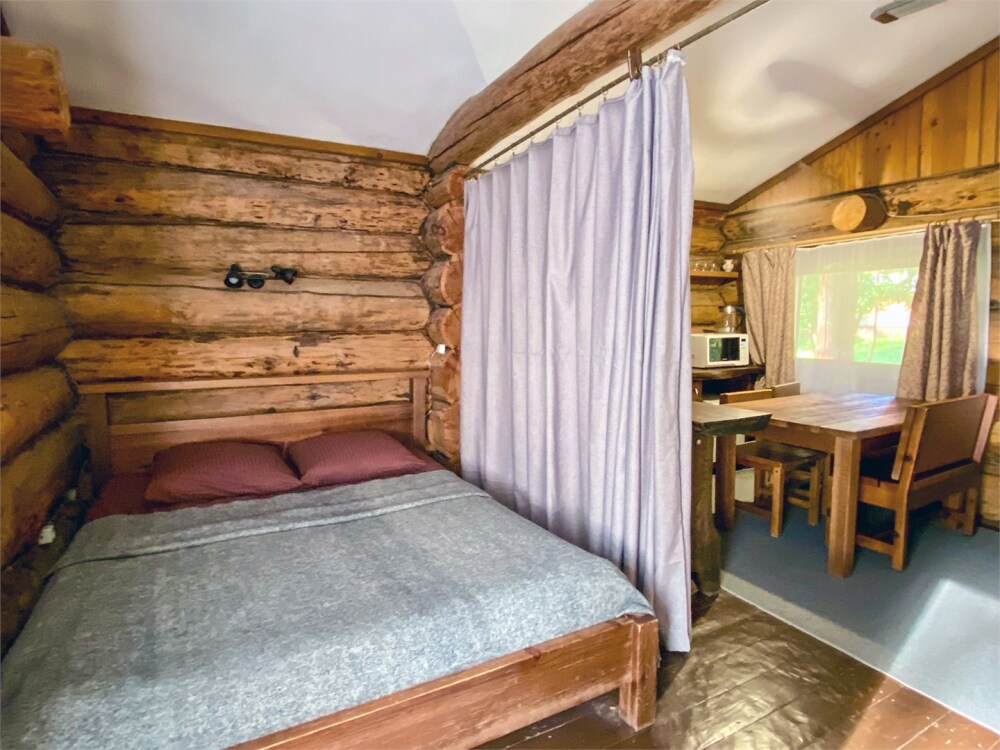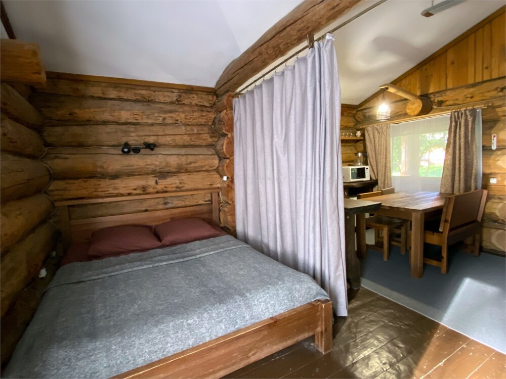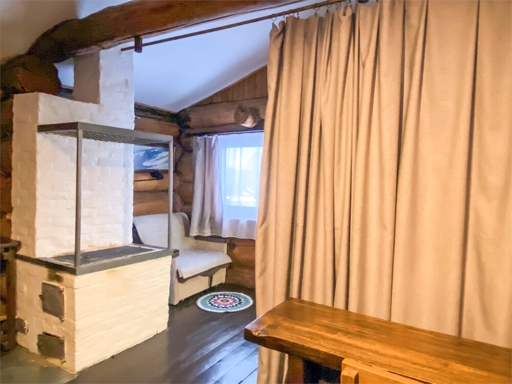 Бревенчатый отдельно стоящий дом из кедра, настоящая печка. Двуспальная евро-кровать, кресло-кровать. Шкаф для одежды, обеденная зона, холодильник, СВЧ-печь, чайник, набор посуды, TV. Душ/туалет, фен, теплый пол. Комплект полотенец.
