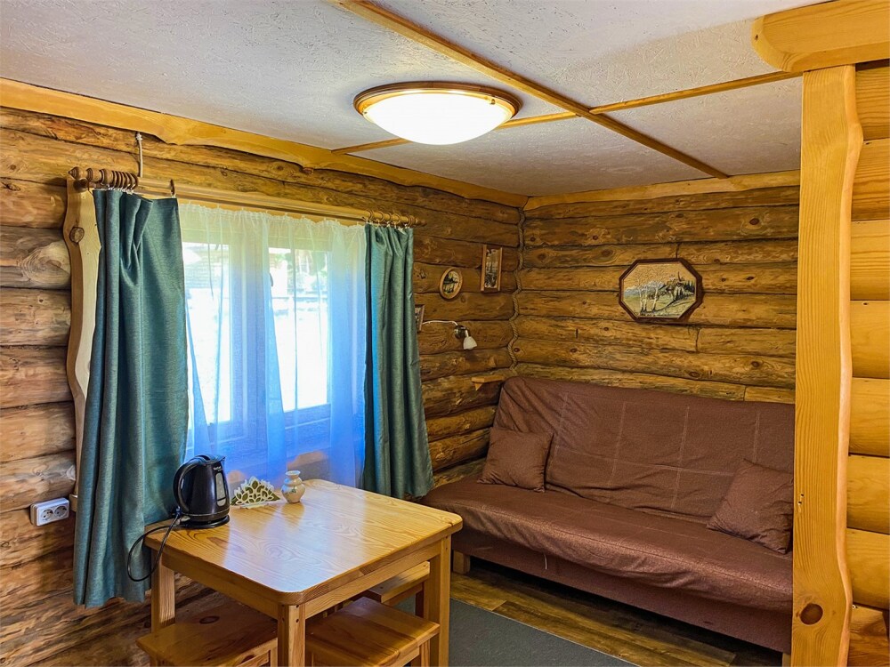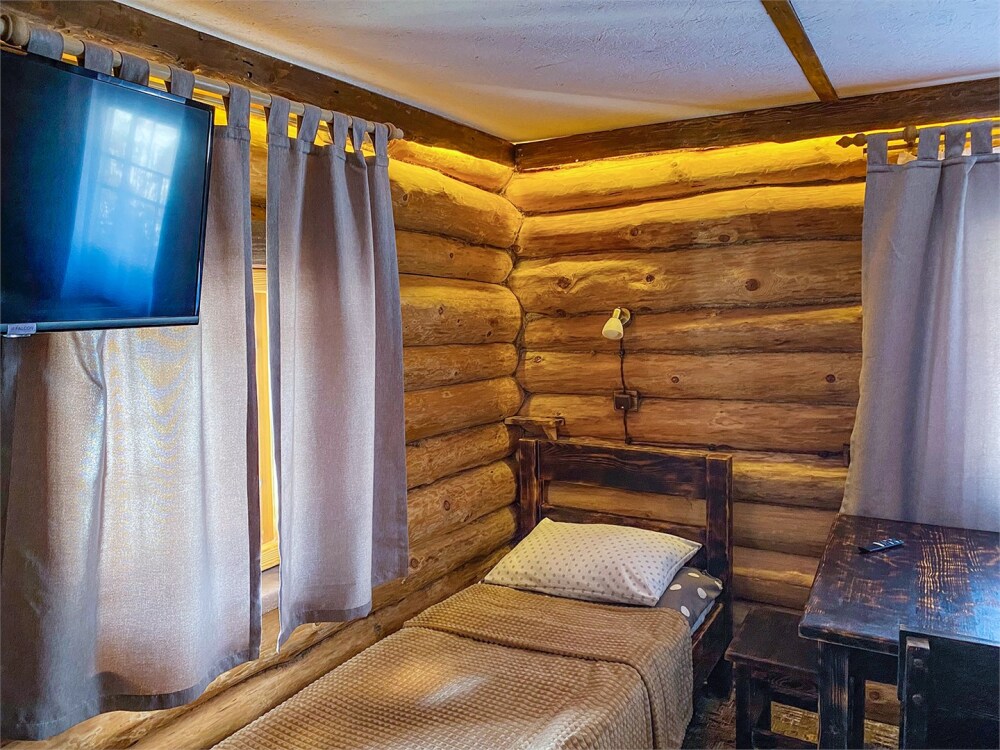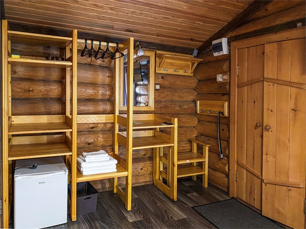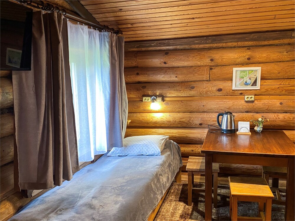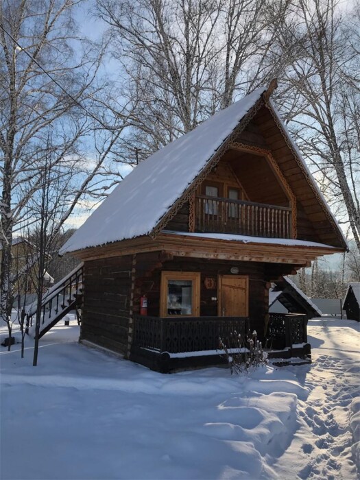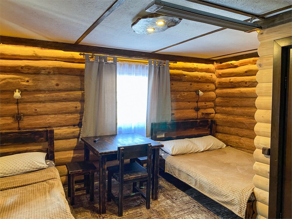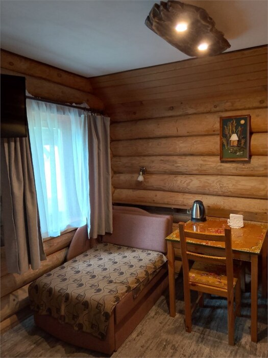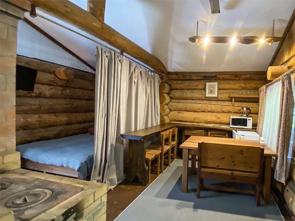 Бревенчатый отдельно стоящий дом из кедра, настоящая печка. Двуспальная евро-кровать, кресло-кровать. Шкаф для одежды, обеденная зона, холодильник, СВЧ-печь, чайник, набор посуды, TV. Душ/туалет, фен, теплый пол. Комплект полотенец.
