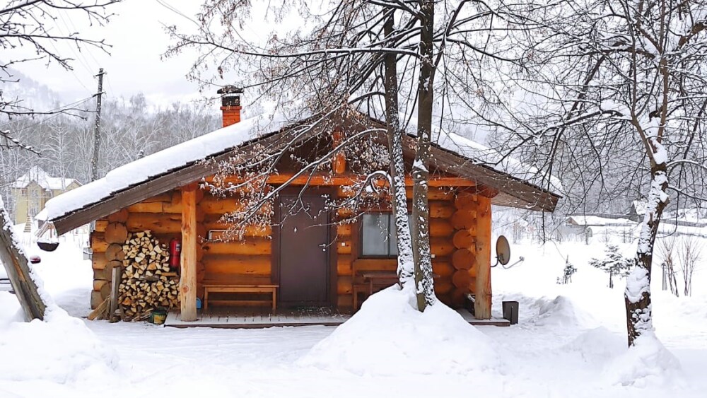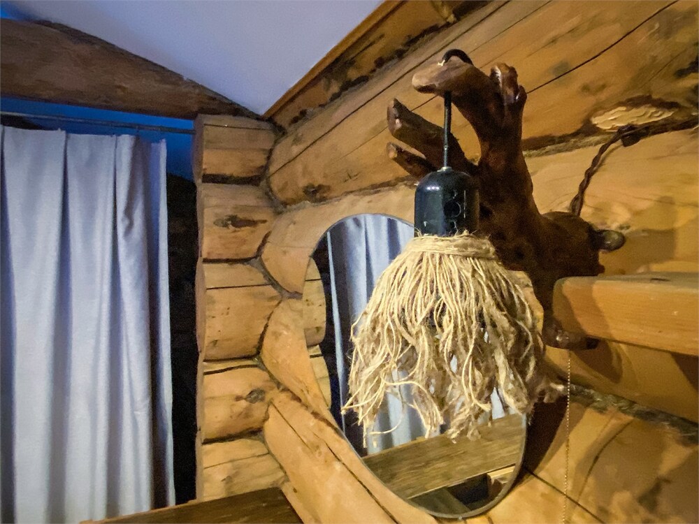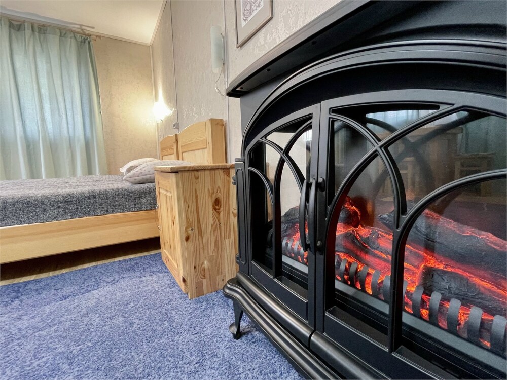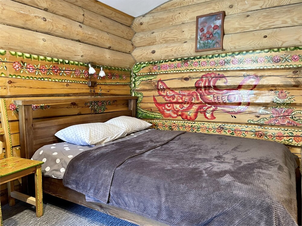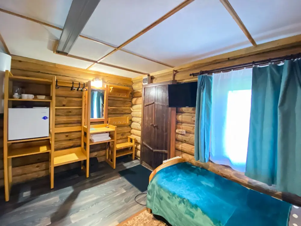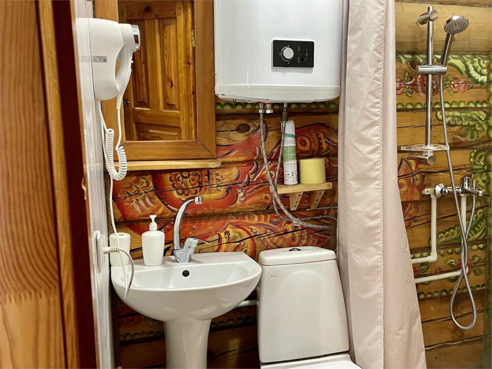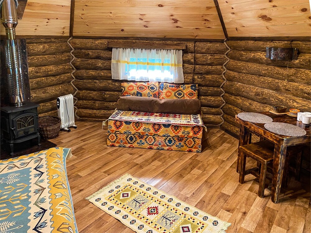 Бревенчатый отдельно стоящий дом из кедра, настоящая печка. Двуспальная евро-кровать, кресло-кровать. Шкаф для одежды, обеденная зона, холодильник, СВЧ-печь, чайник, набор посуды, TV. Душ/туалет, фен, теплый пол. Комплект полотенец.
