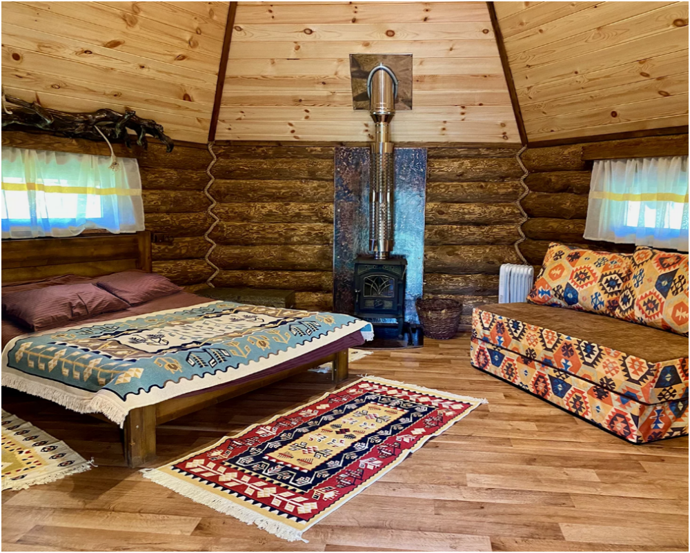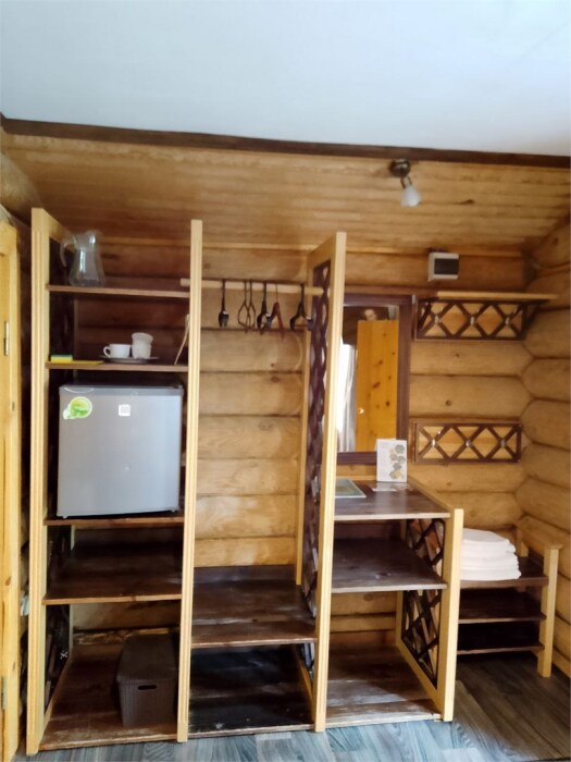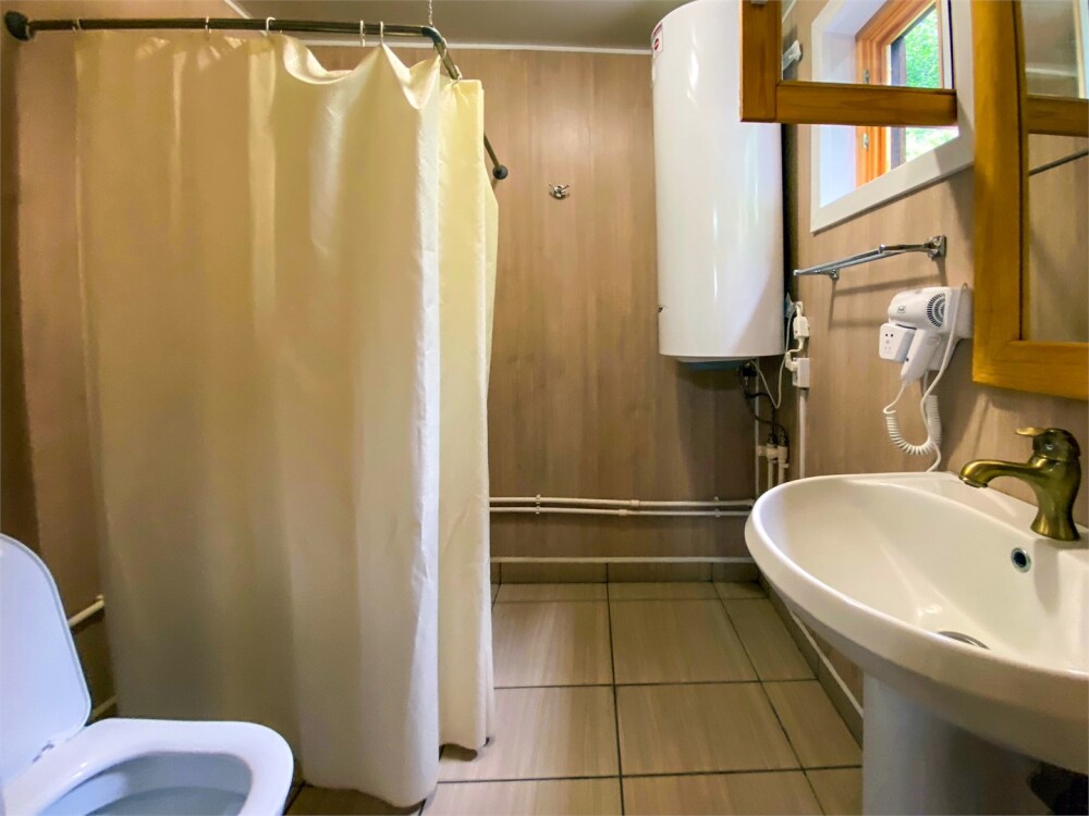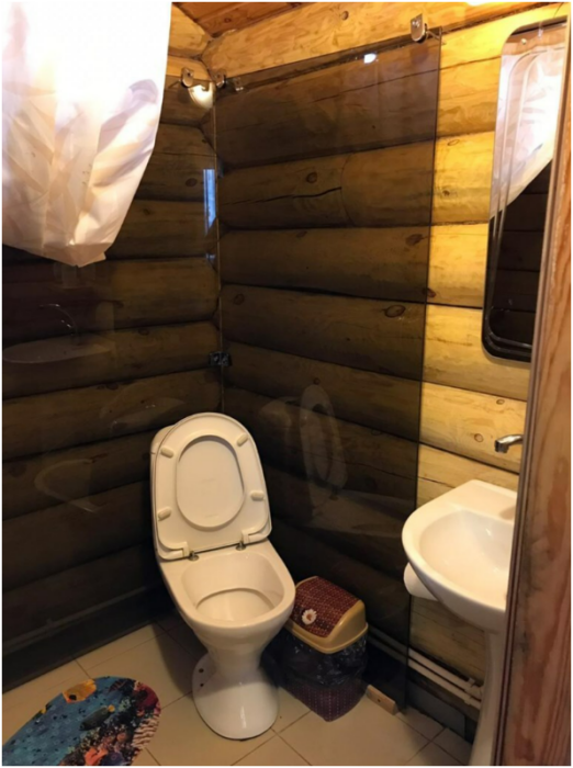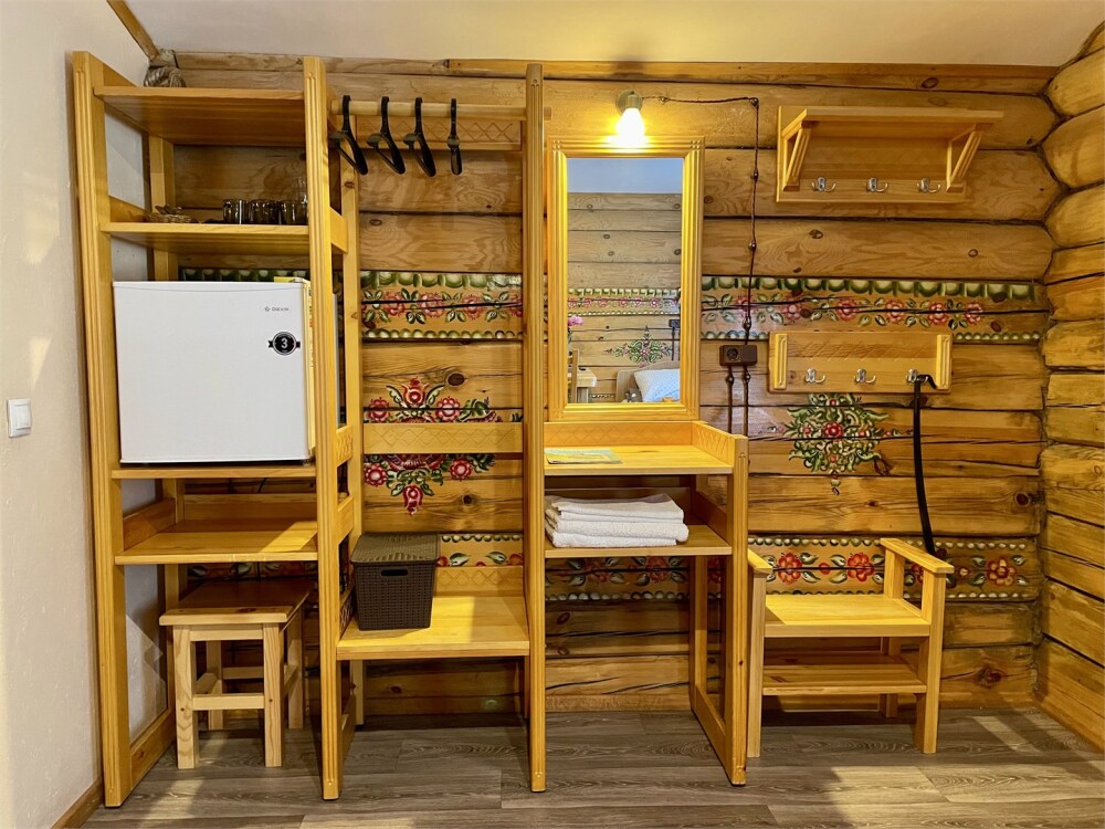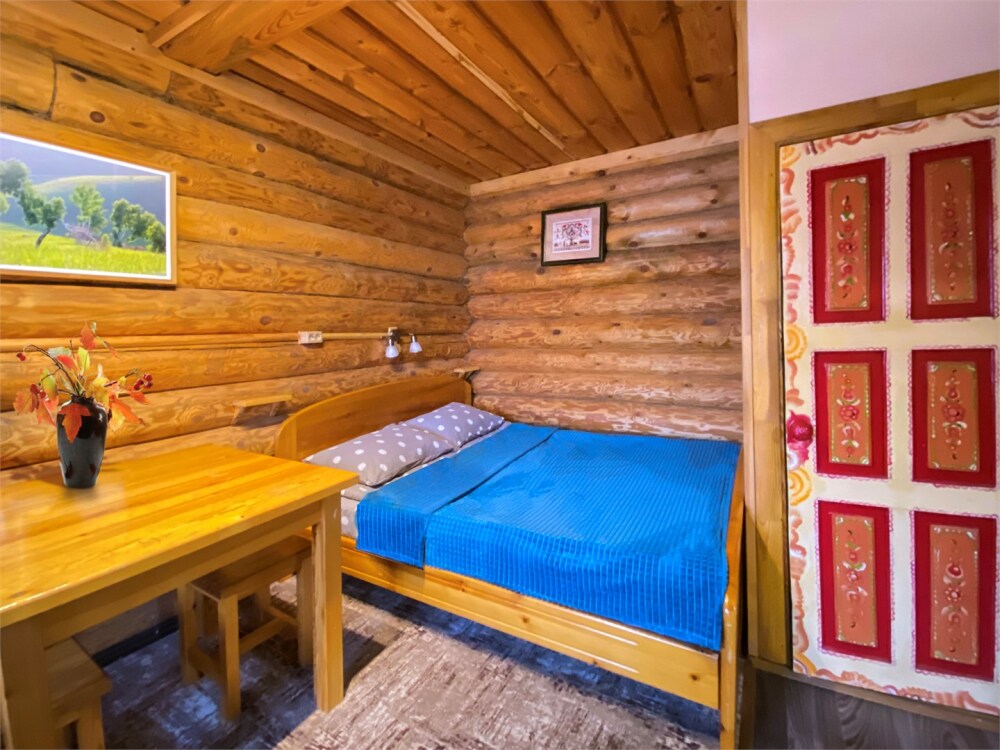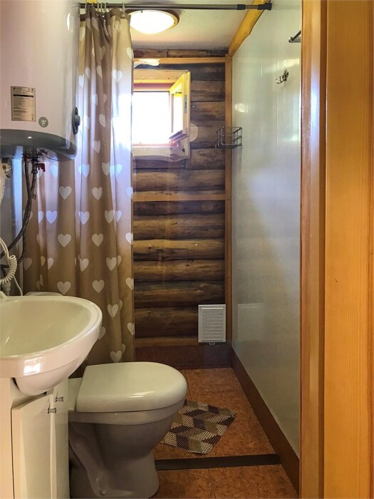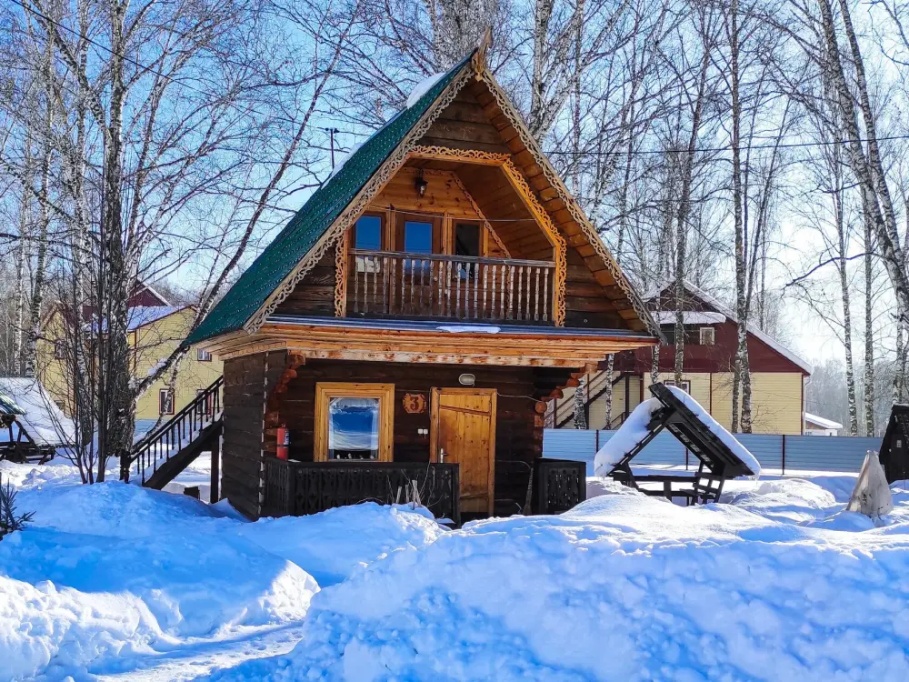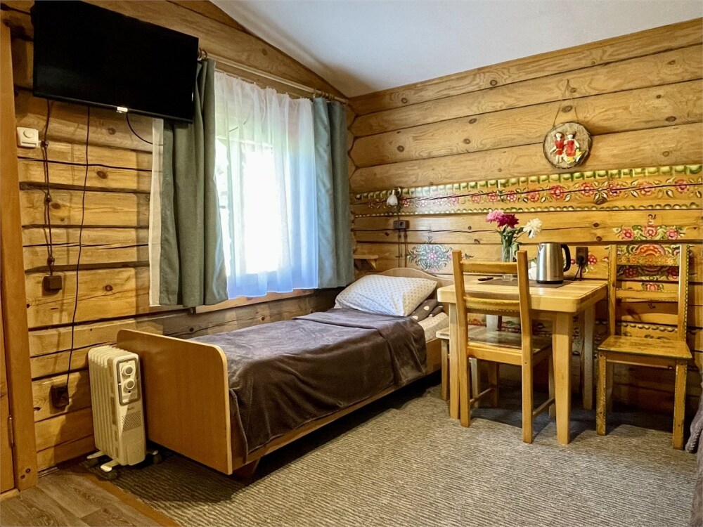 Бревенчатый отдельно стоящий дом из кедра, настоящая печка. Двуспальная евро-кровать, кресло-кровать. Шкаф для одежды, обеденная зона, холодильник, СВЧ-печь, чайник, набор посуды, TV. Душ/туалет, фен, теплый пол. Комплект полотенец.