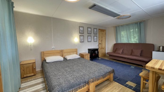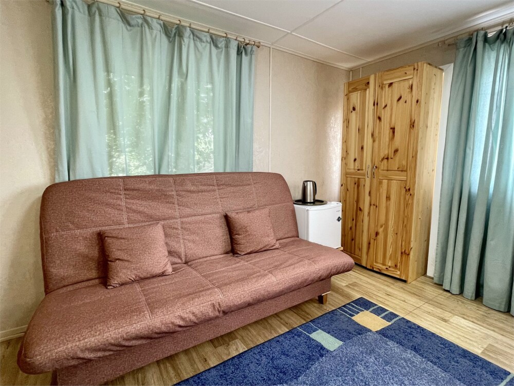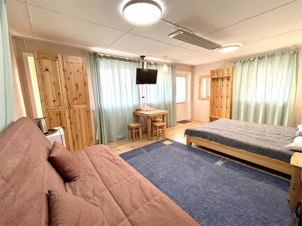 Двуспальная кровать и диван. Обеденная зона, холодильник, чайник, набор посуды, гардероб. Душ, туалет, г/х вода.