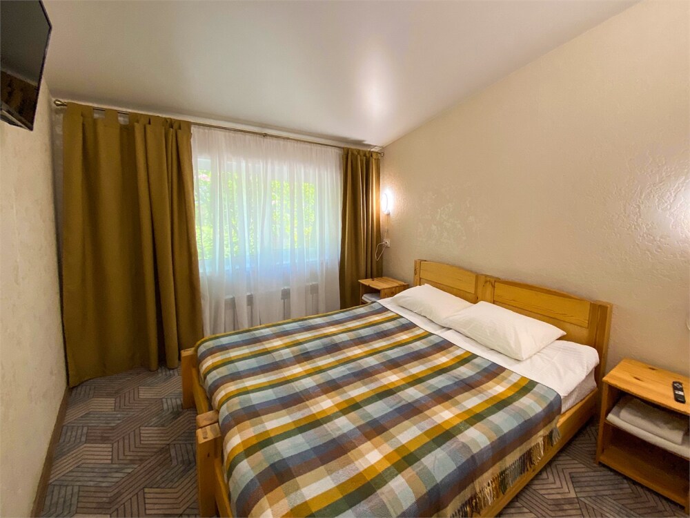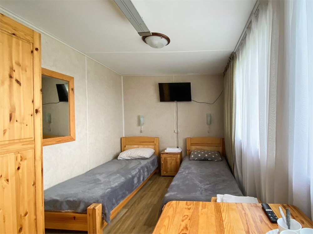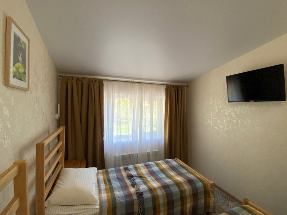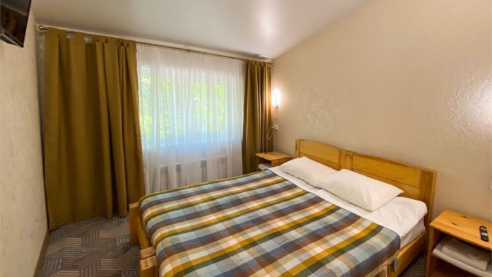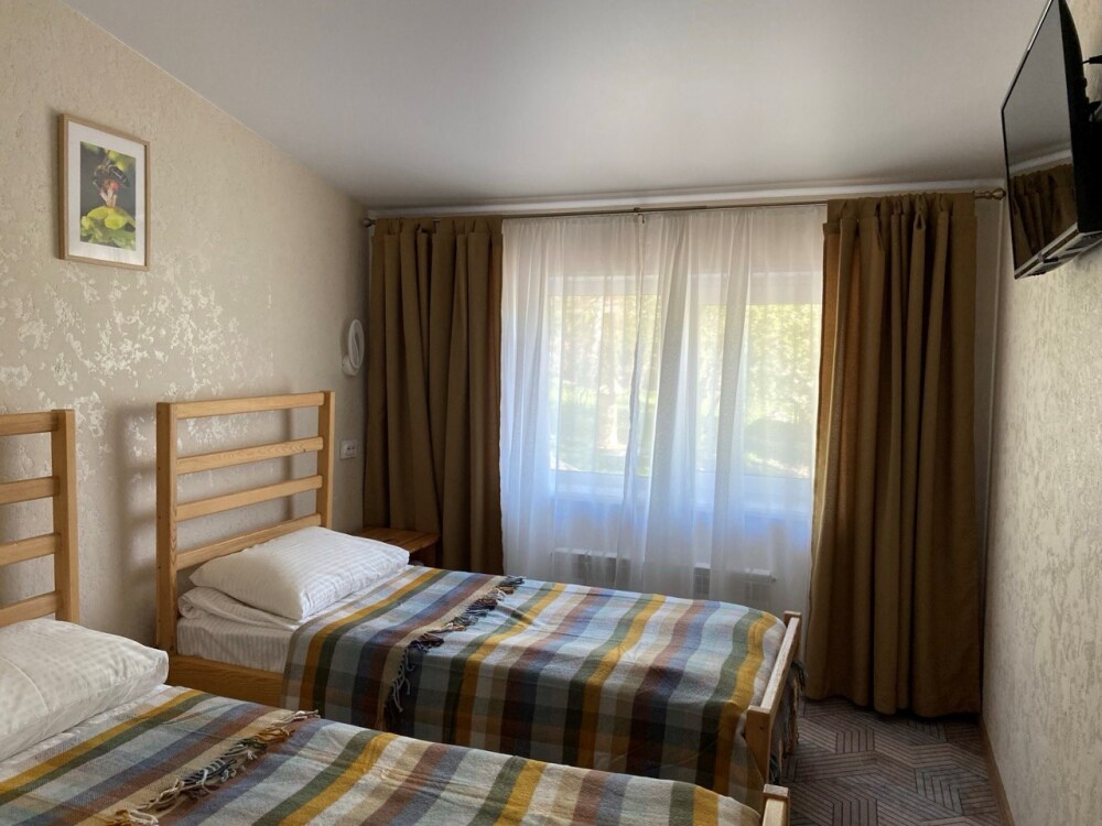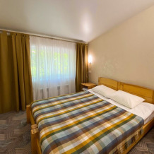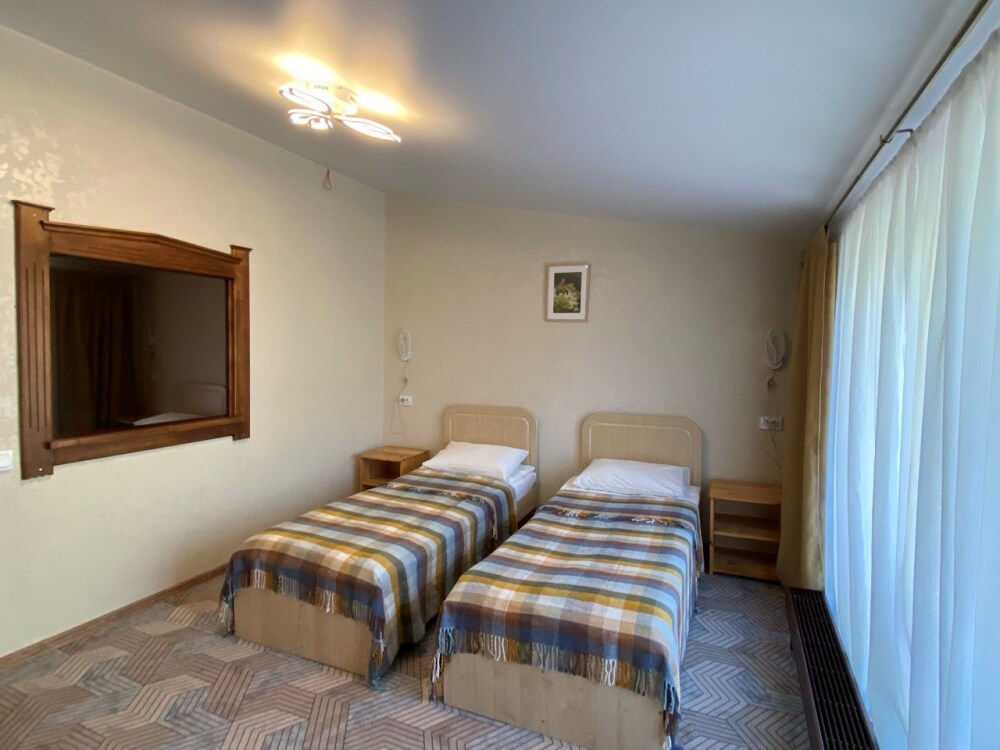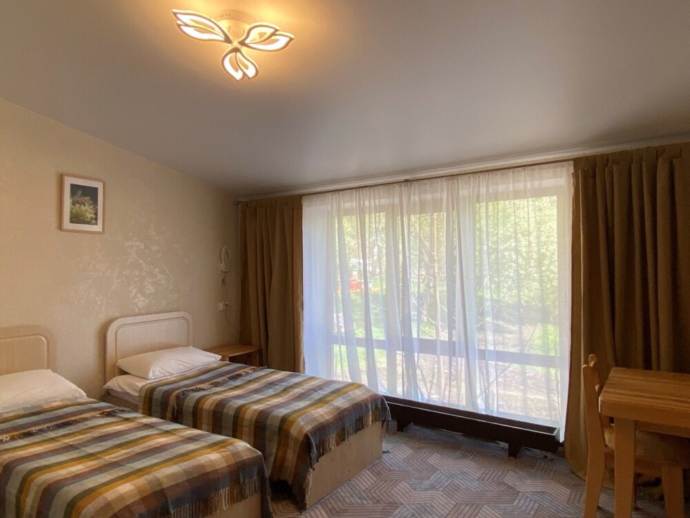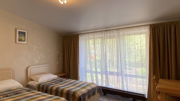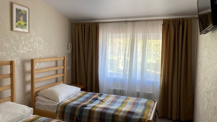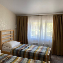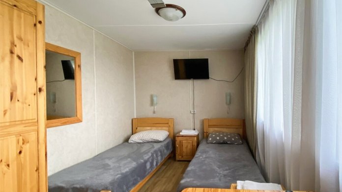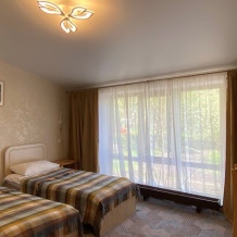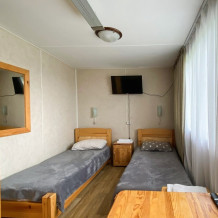 В номере: две односпальные кровати (формируются в 2-спальную), диван, шкаф для одежды, стол, стулья, ТВ.