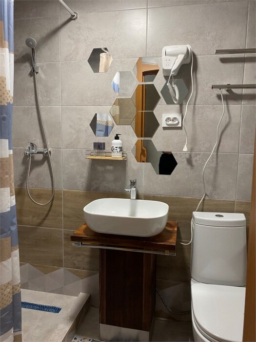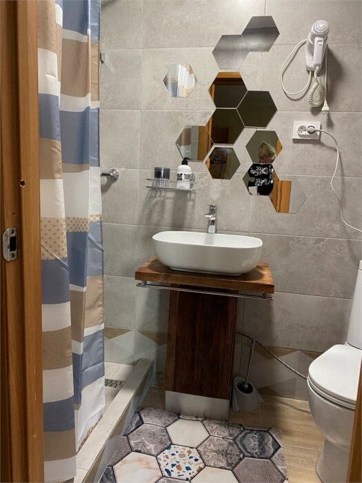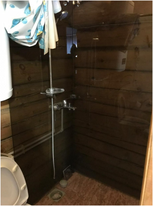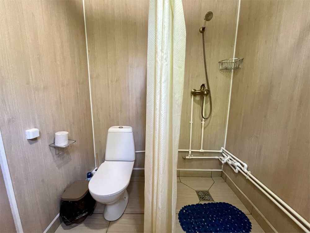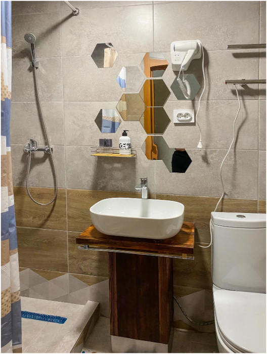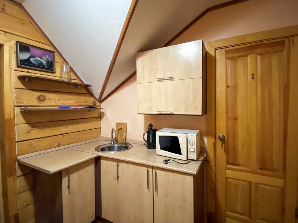 Кухонная зона на 3 номера (кухонный шкафчик, раковина, эл. чайник, мини-холодильник), санузел на 3 номера (душ, унитаз, раковина, зеркало, водонагреватель, г/х вода, туалетные средства).