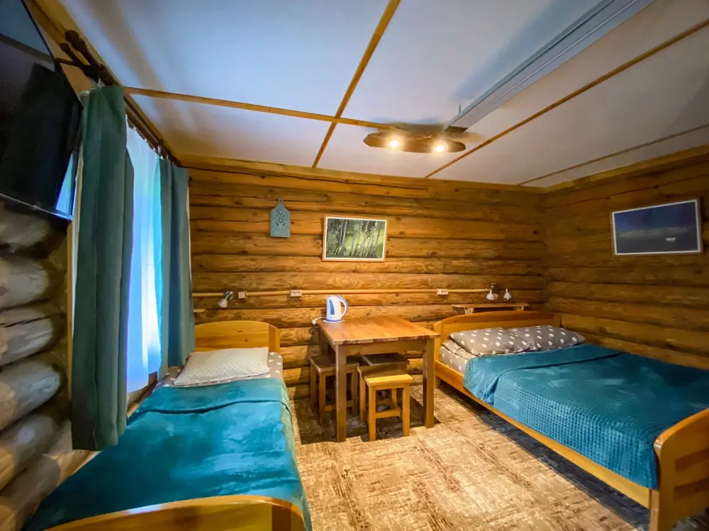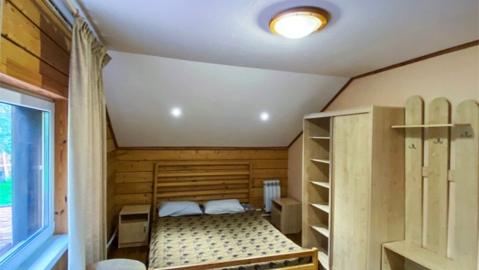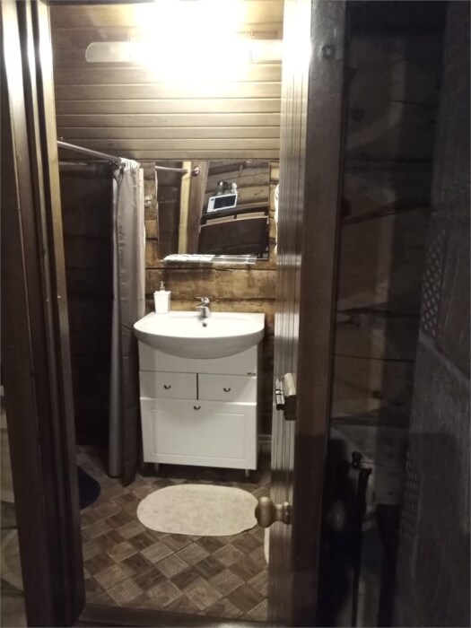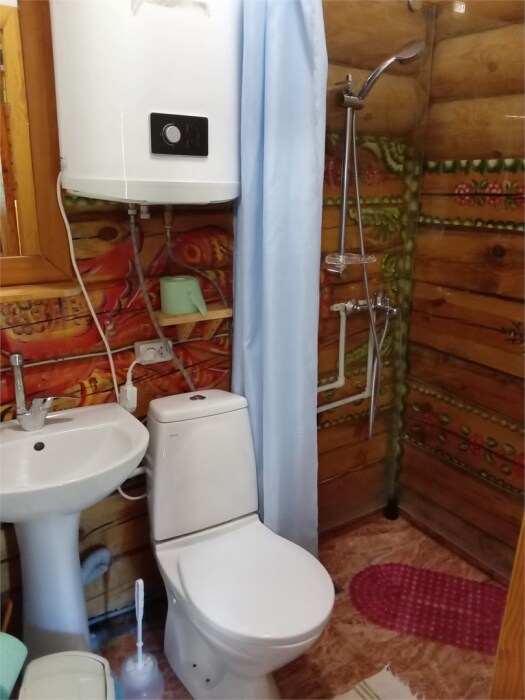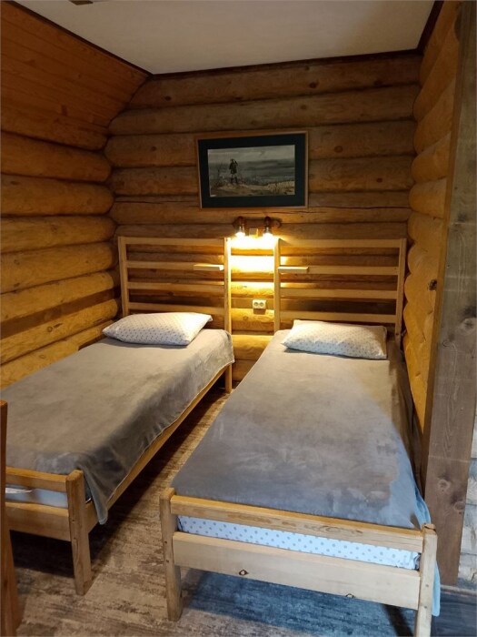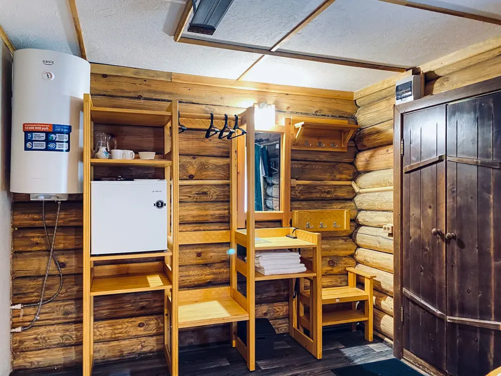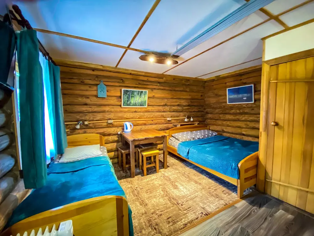 Рубленный дом из сосны, отдельно стоящий. Двуспальная кровать, односпальная кровать. Обеденная зона, холодильник, чайник, набор посуды, гардероб. Душ, туалет, г/х вода, фен.