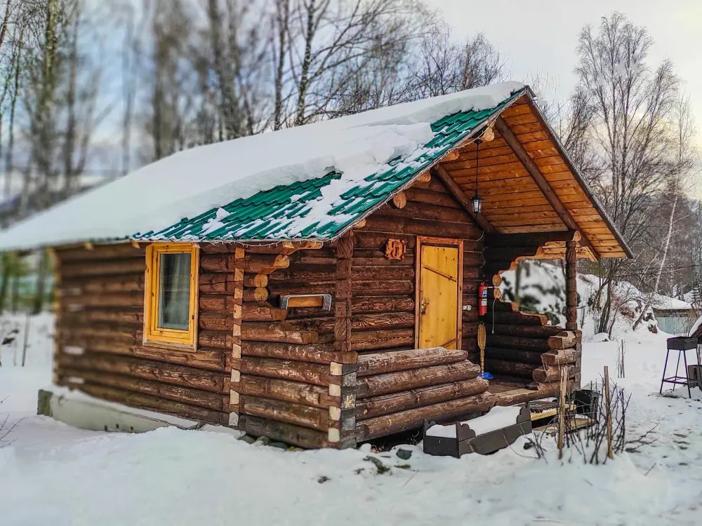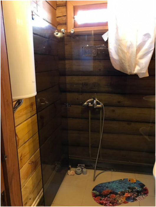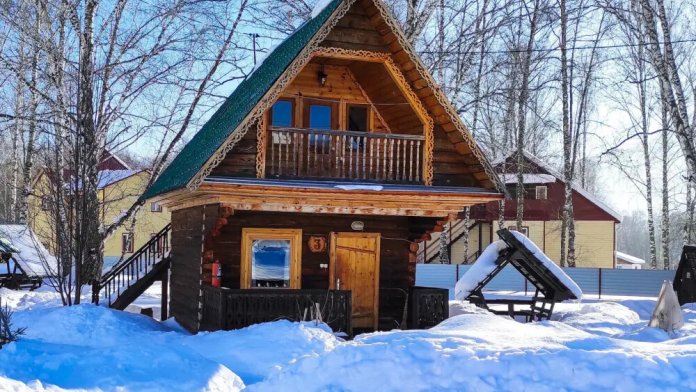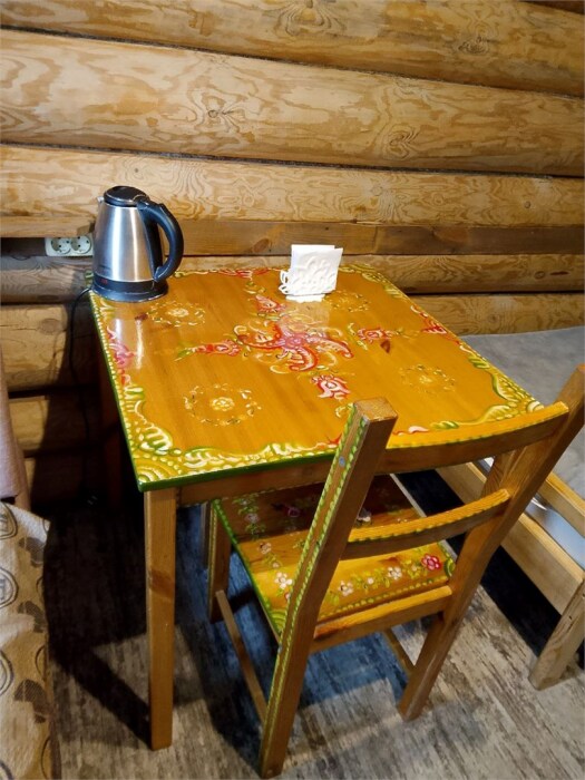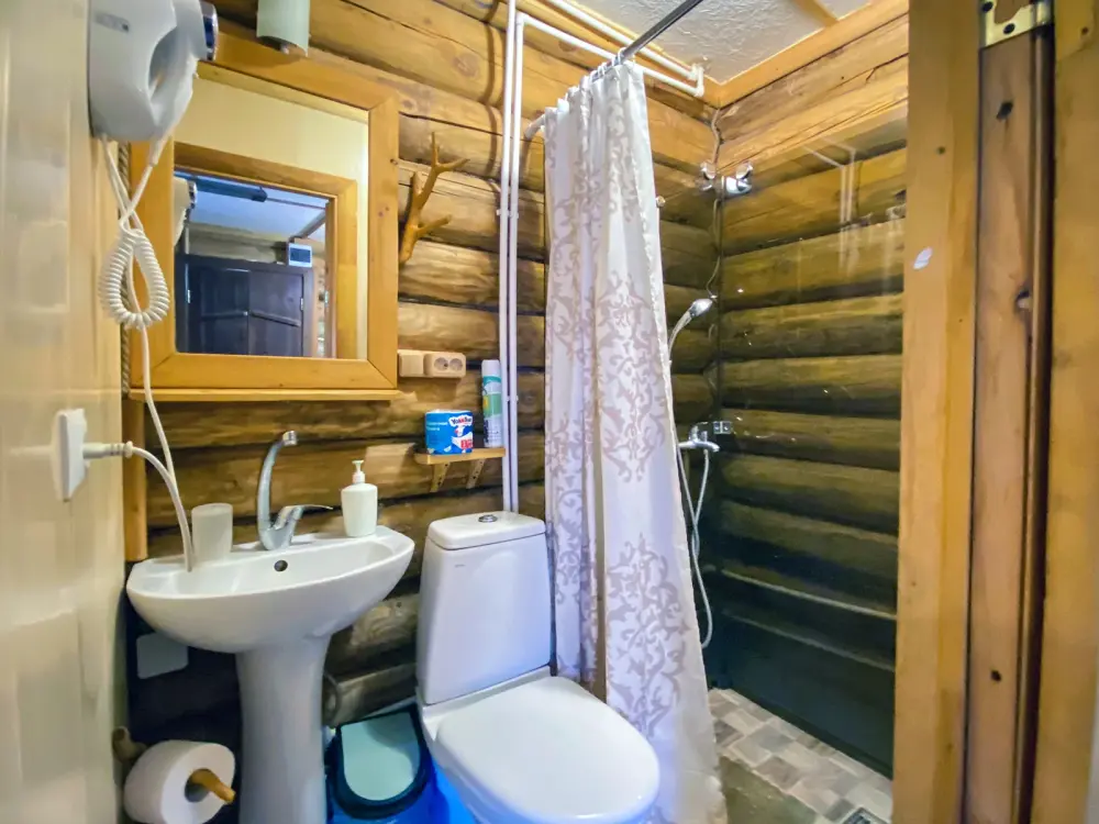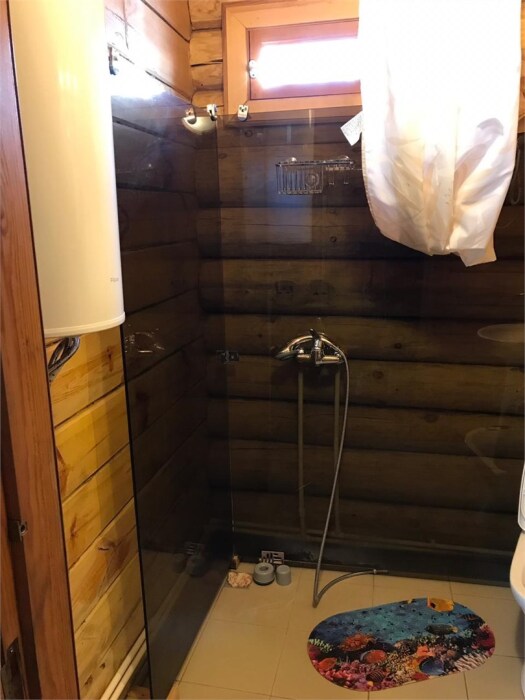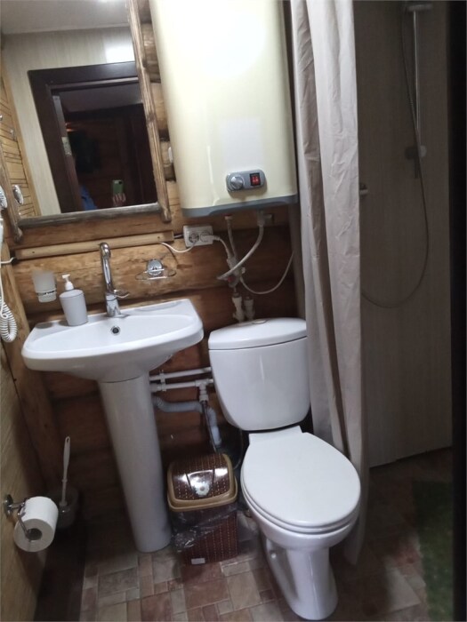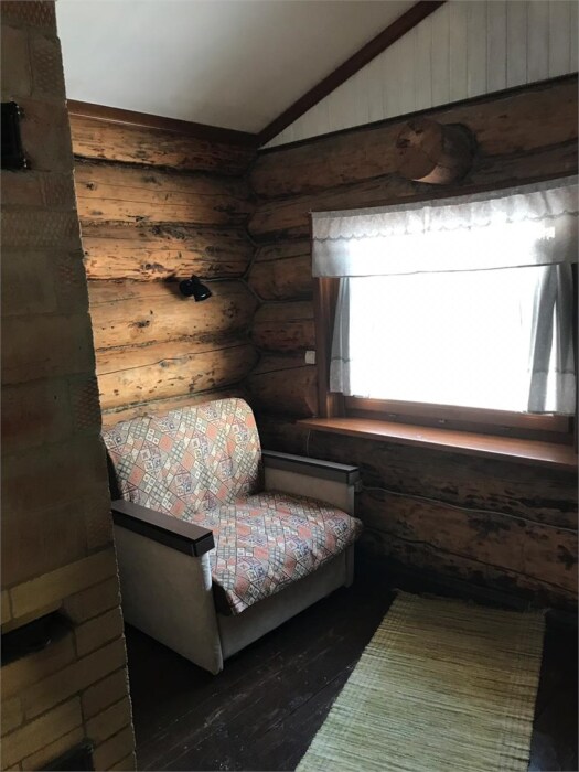 Рубленный дом из сосны, отдельно стоящий. Двуспальная кровать, односпальная кровать. Обеденная зона, холодильник, чайник, набор посуды, гардероб. Душ, туалет, г/х вода, фен.