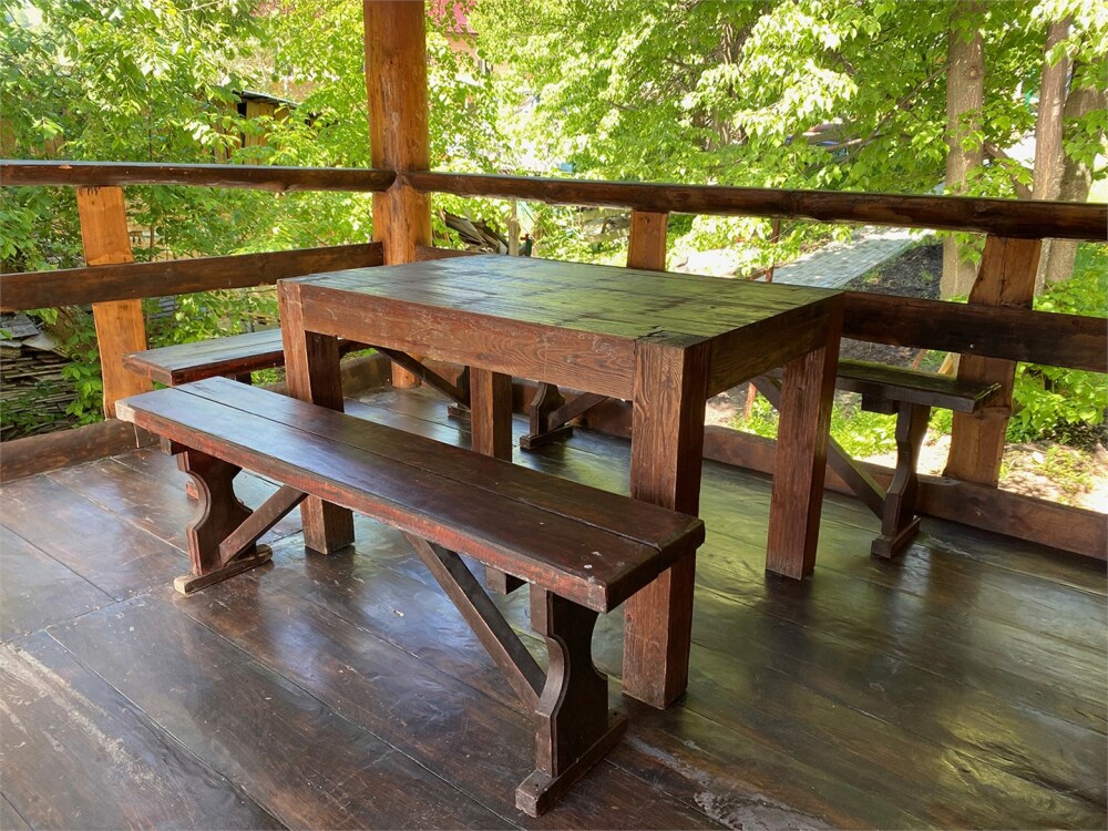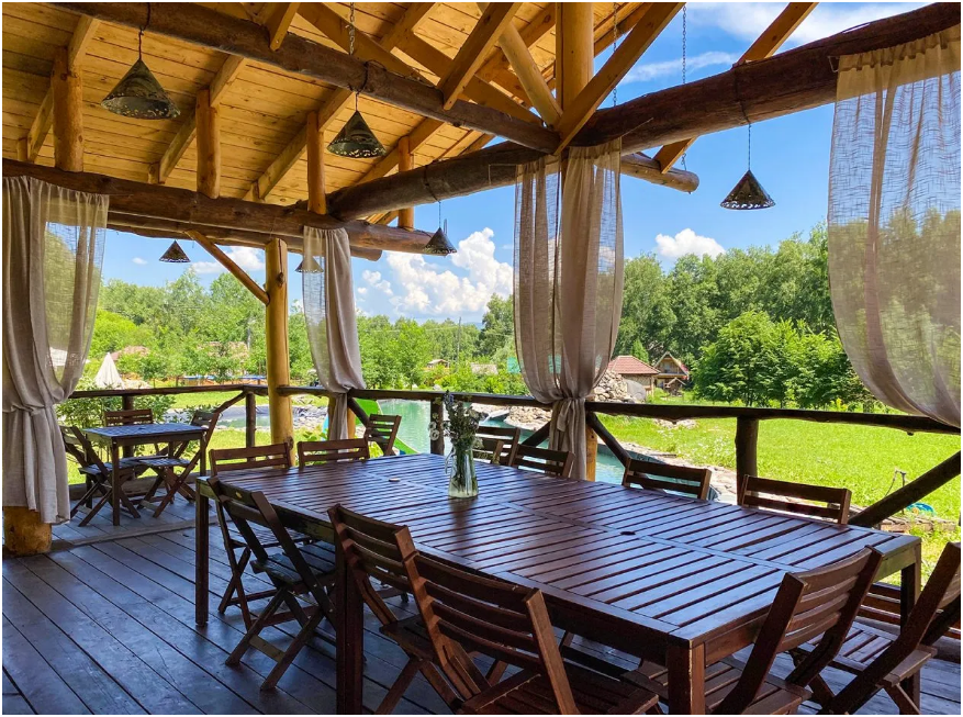 В доме просторная веранда с большим столом и зоной для барбекю. Прекрасный вид на фруктовый сад и пасеку.