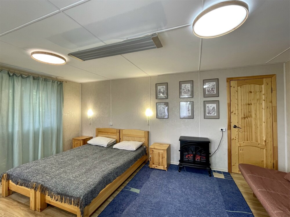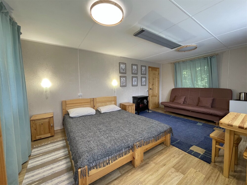 Двуспальная кровать, односпальная кровать. Обеденная зона, холодильник, чайник, набор посуды, гардероб. Душ, туалет, г/х вода, фен.