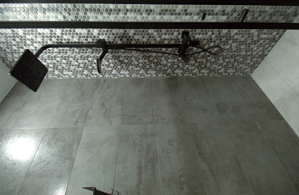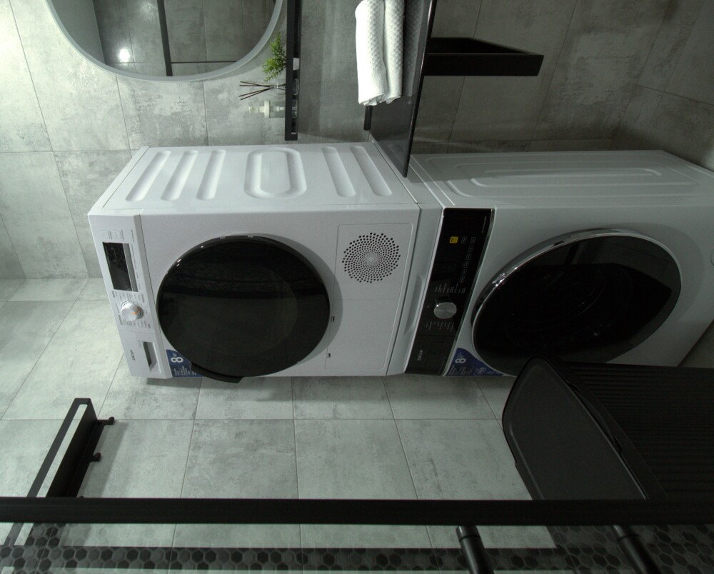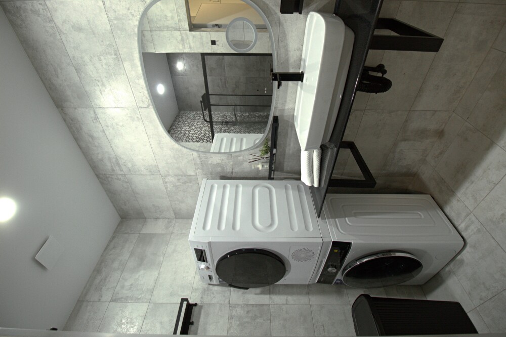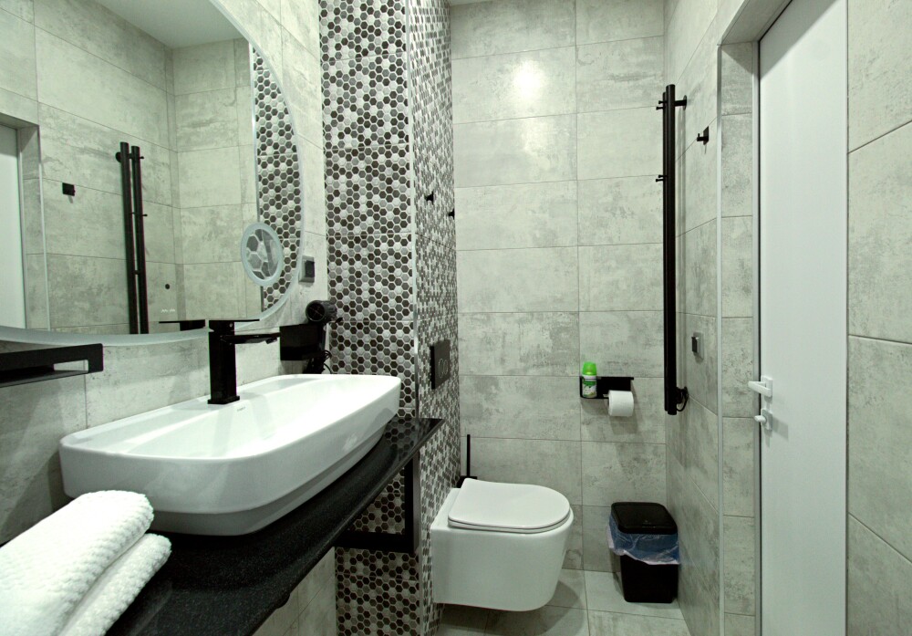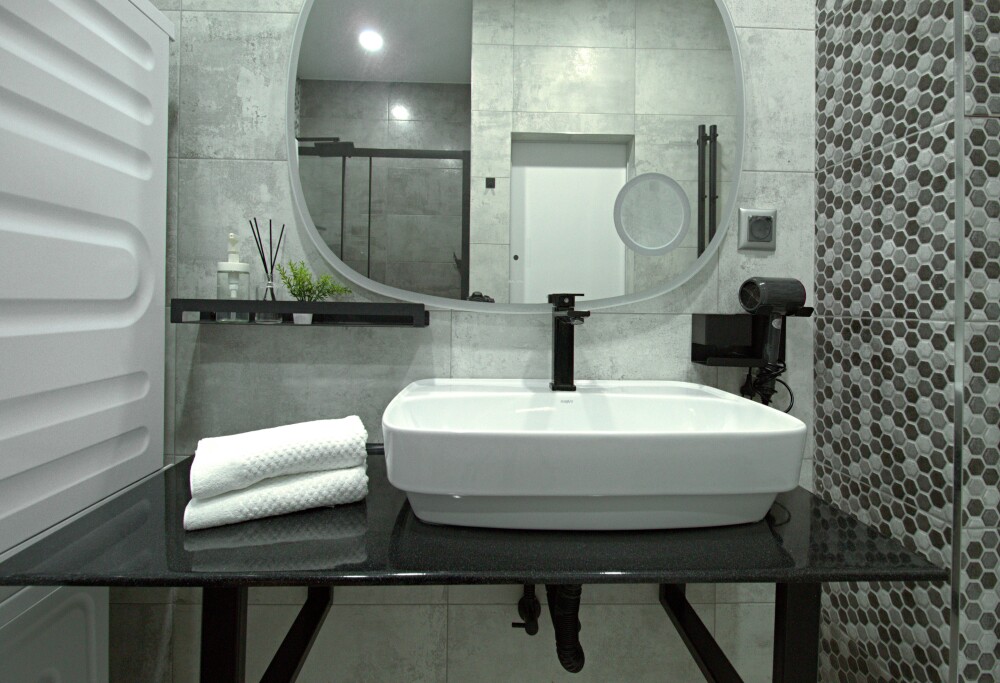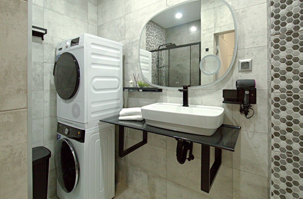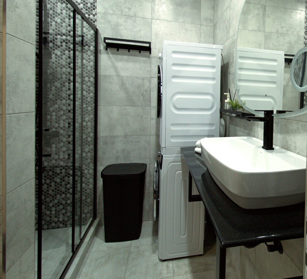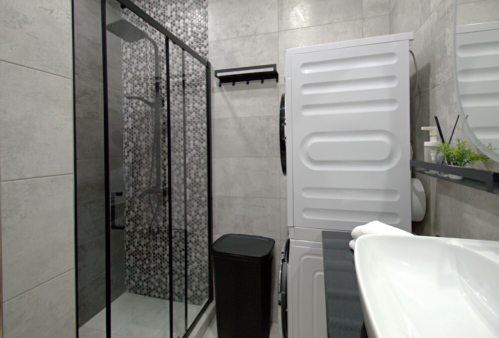 Стильный санузел с душевой кабиной, раковиной, зеркалом и феном.