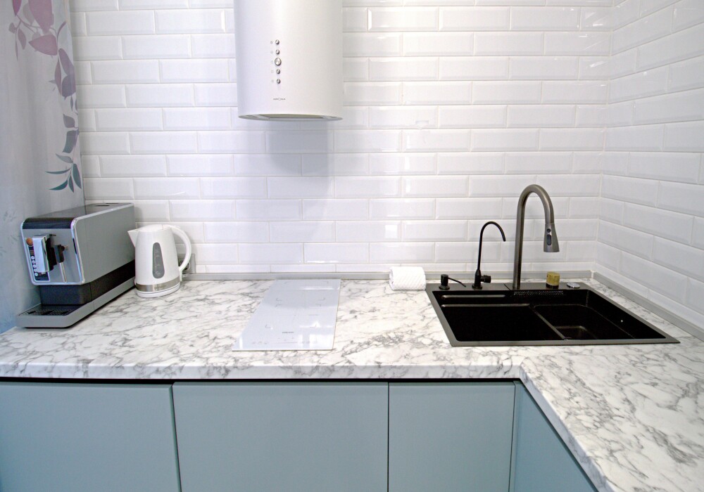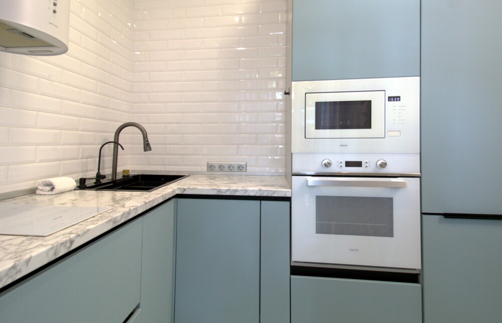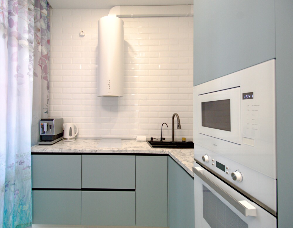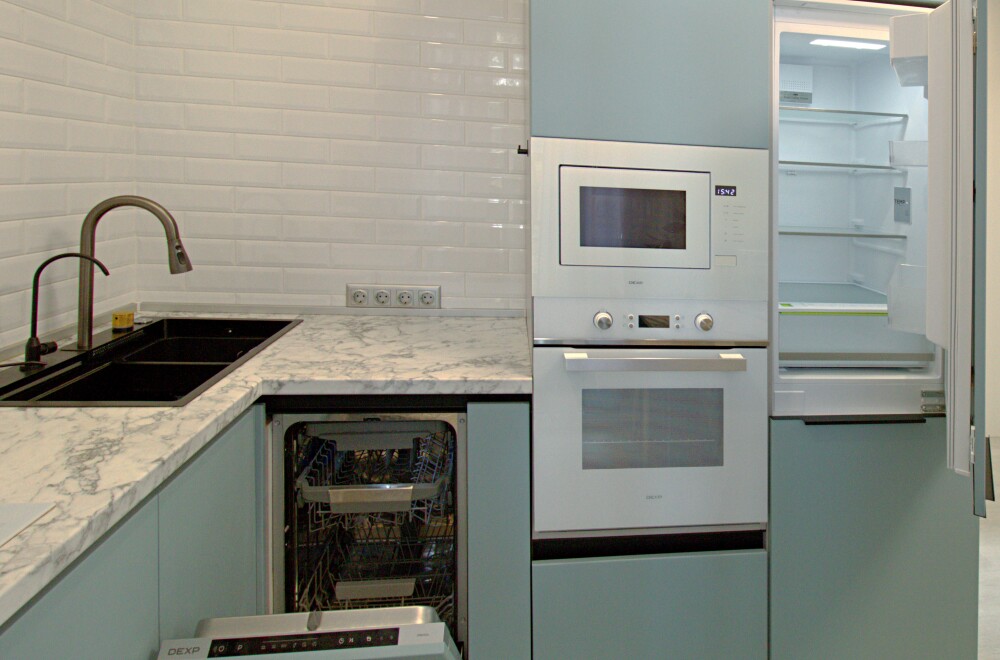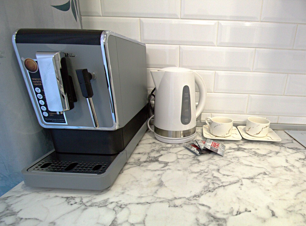 Полностью оборудованная кухня с плитой, холодильником и электрическим чайником, готовая к созданию кулинарных шедевров.