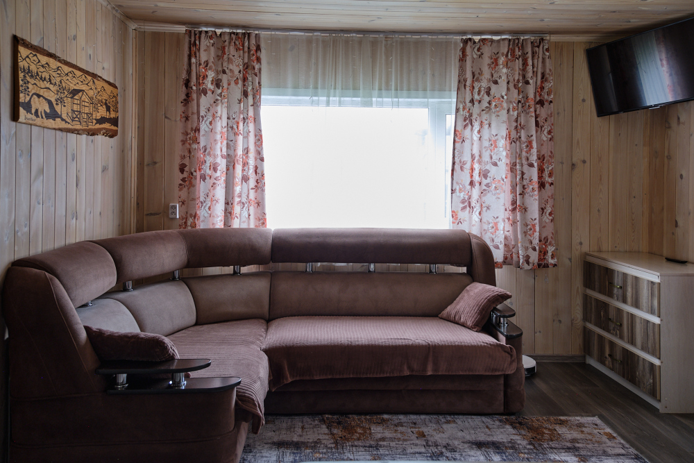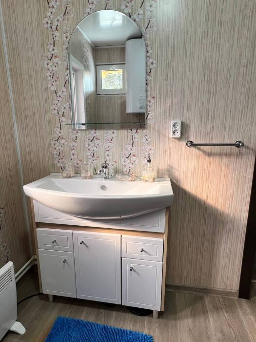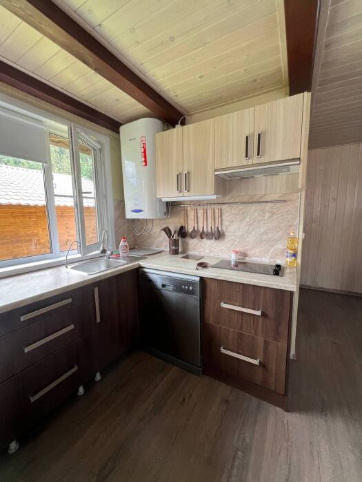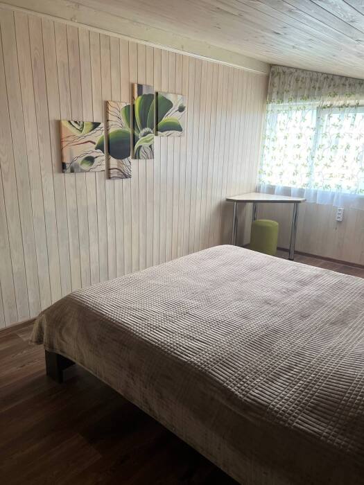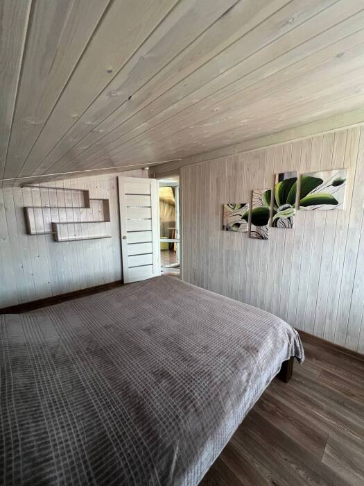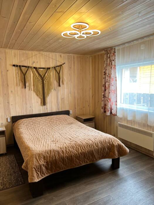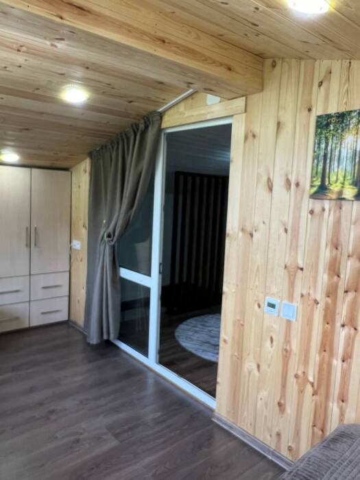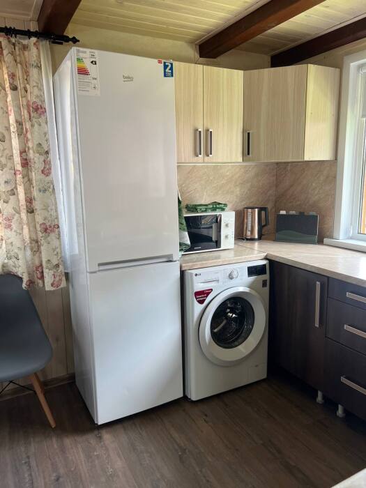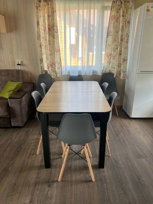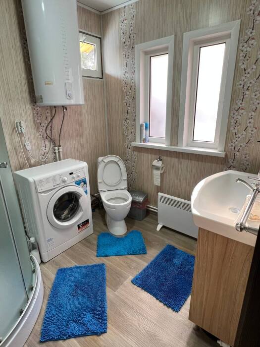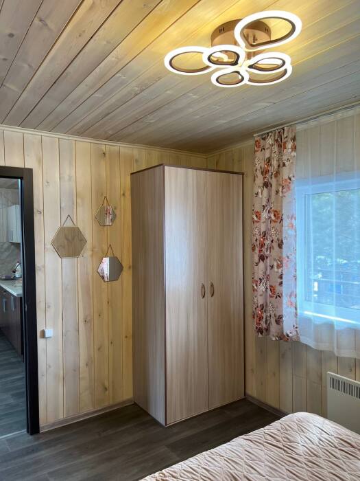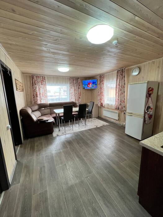 Дом на 6 гостей 1-этажный. В доме две комнаты в каждой двухспальная кровать, гостиная с кухонной зоной, тёплым полом, wi-fi, телевизором и угловым диваном, большой обеденный стол. На кухне вся необходимая посуда, холодильник, микроволновая печь, чайник, плита, кастрюли, сковородки. Санузел оснащён стиральной машиной, фен, полотенца. Сушилка для белья, утюг, гладильная доска. Дом рассчитан для комфортного проживания (до 6 человек), возможно поставить одно доп. место раскладушку.
