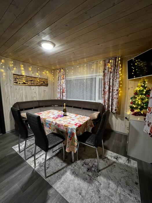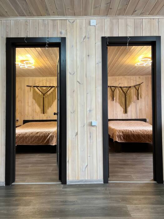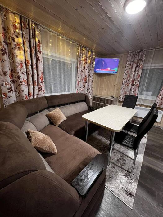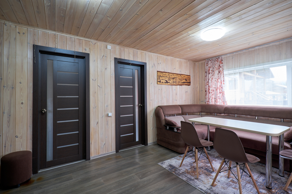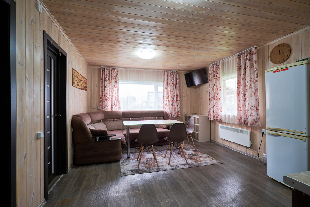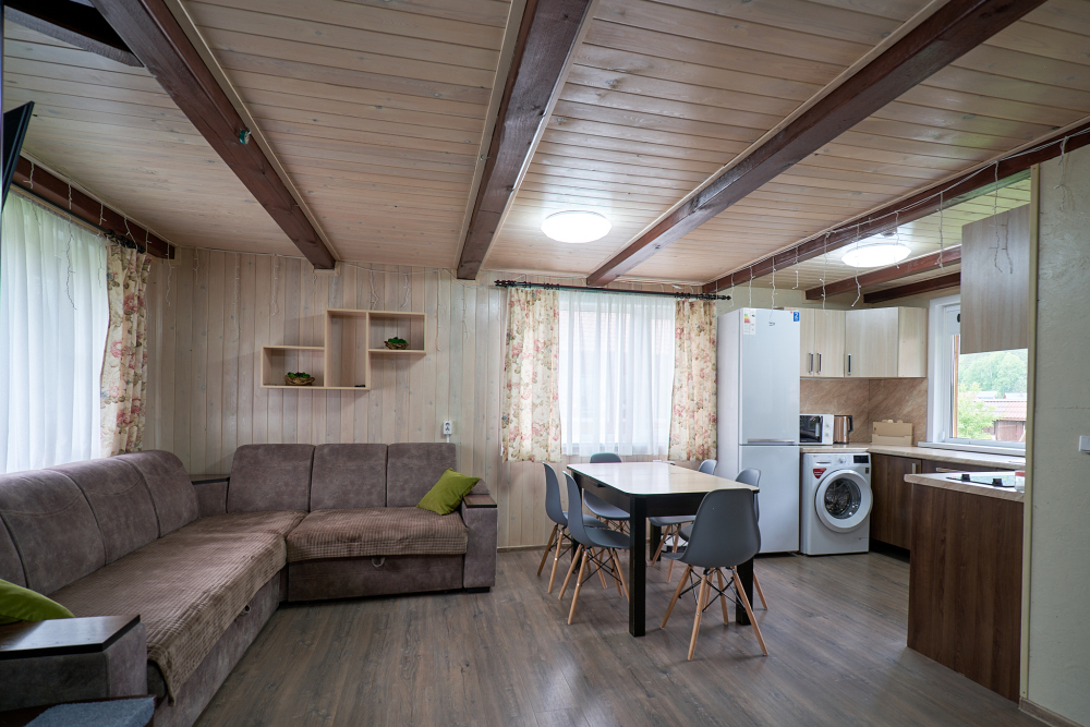 В доме две комнаты, в каждой комнате двухспальная кровать, гостиная с кухонной зоной, тёплым полом, wi-fi, телевизором и угловым диваном еще на два человека, большой обеденный стол.