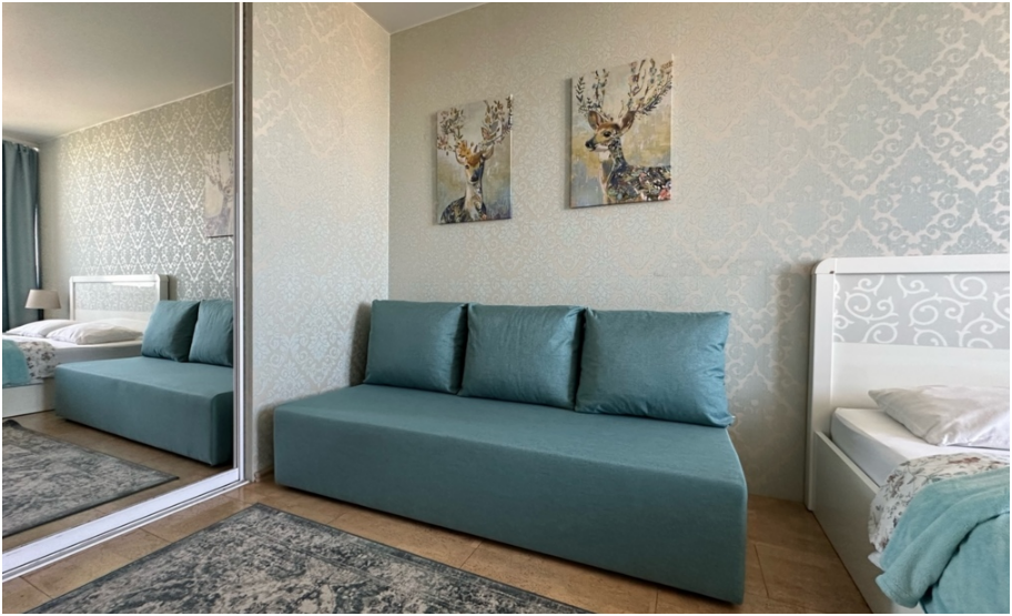 Уютные двухкомнатные апартаменты. Комфортное размещение до 4 человек, 2+2: удобная двухспальная кровать с ортопедическим матрасом в отдельной спальне, двухместный диван-кровать в гостиной.