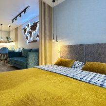 Студия с захватывающим видом с 20-го этажа на центр Казани и озеро Кабан. Центральным украшением студии является карта мира с цветными подсветками, благодаря которой Вы сами задаете тон своего настроения. Парящая кровать унесет Вас в самые сладкие сны, а космическая ванная восстановит Ваши силы в расслабляющем джакузи после насыщенного дня. Самый удачный выбор для красивых фотосессий. В студии комфортно разместятся до 4-х человек: оборудованная стильная кухня- стиральная и сушильная машины. Есть возможность размещения большой семьи или компании на две смежные квартиры с общим тамбуром.