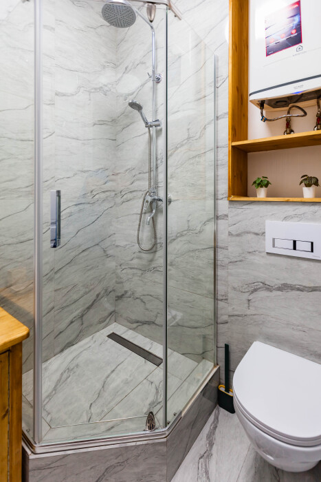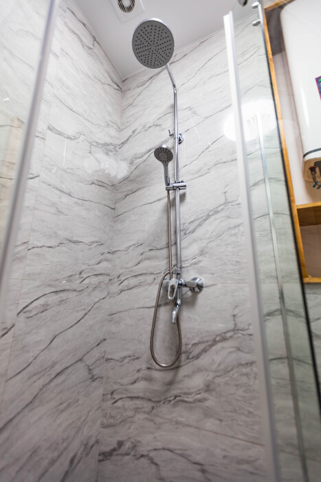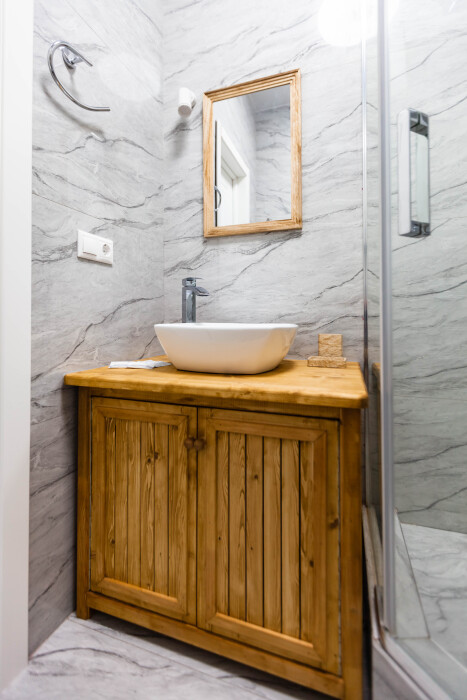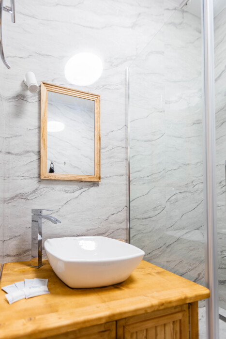 - Стильный санузел с душевой кабиной, раковиной, зеркалом и феном.