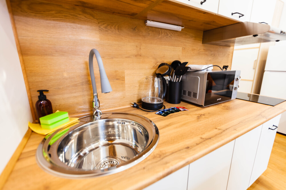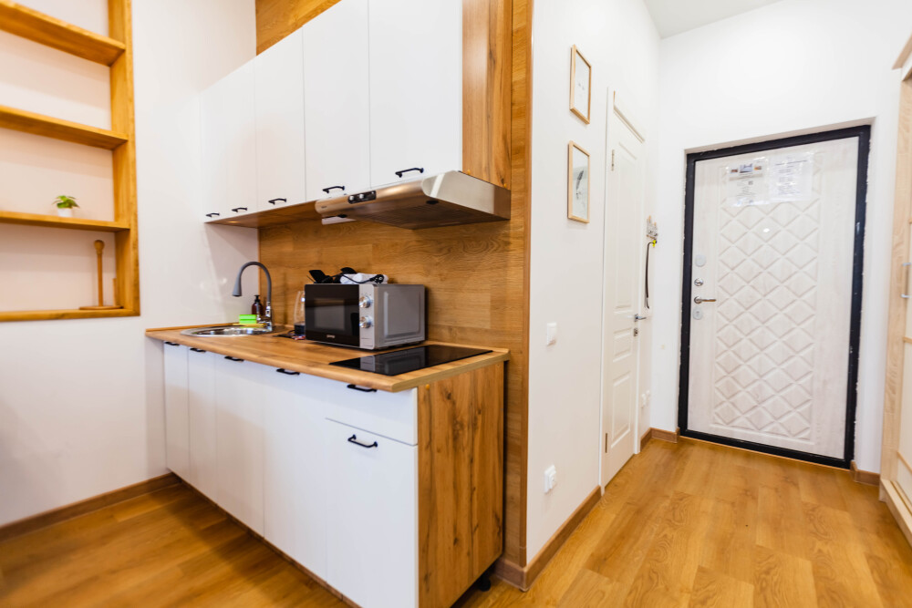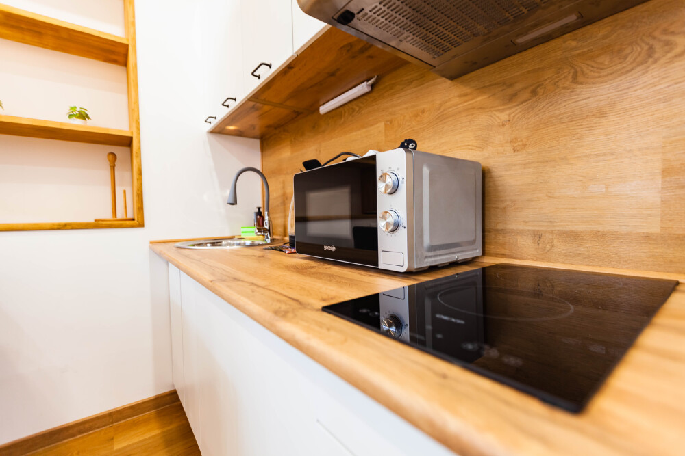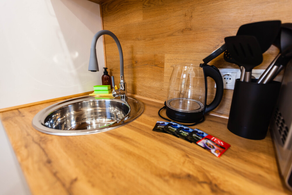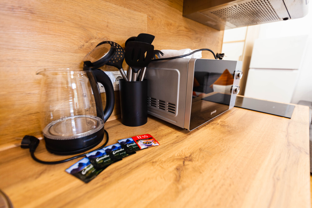 - Полностью оборудованная кухня с плитой, холодильником и электрическим чайником, готовая к созданию кулинарных шедевров.