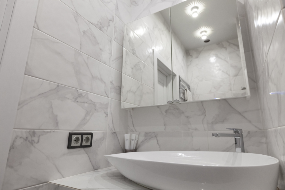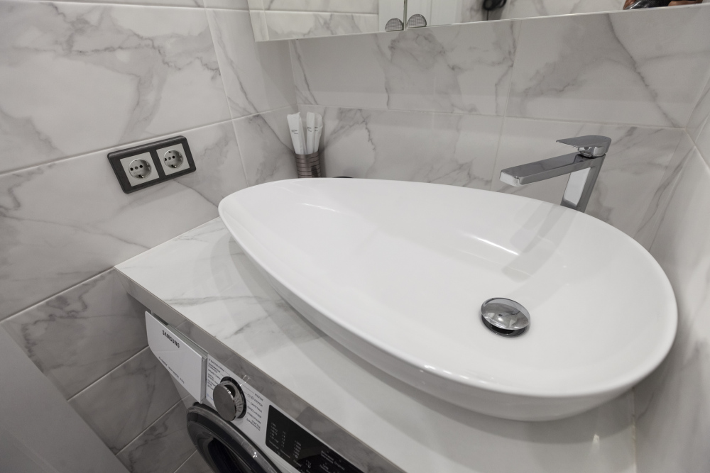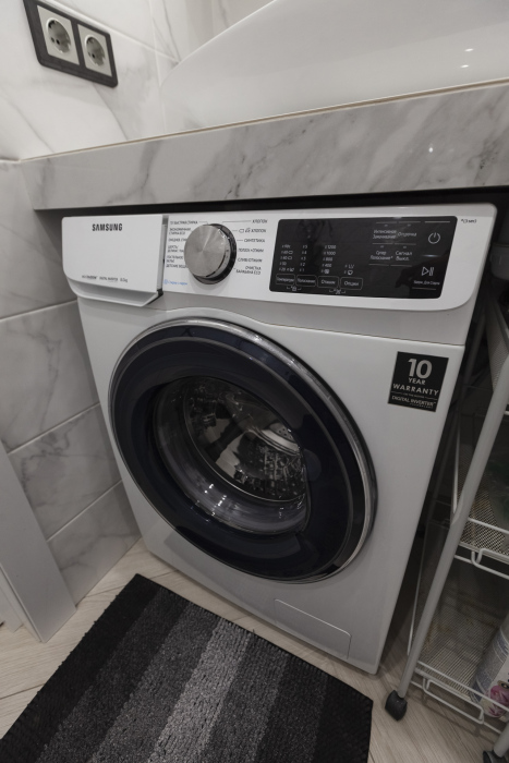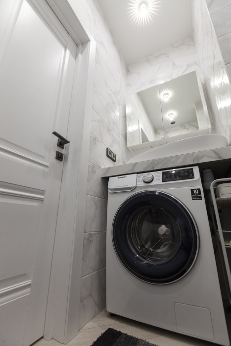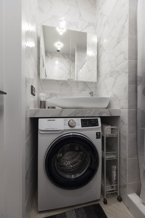 - Стильный санузел с душевой кабиной, раковиной, зеркалом, стиральной машиной и феном.