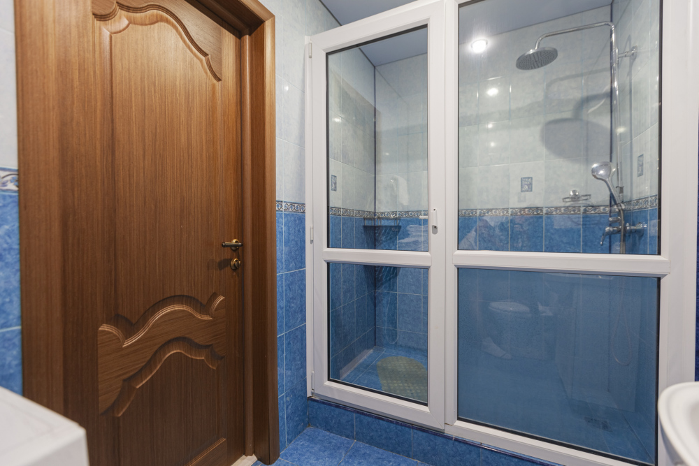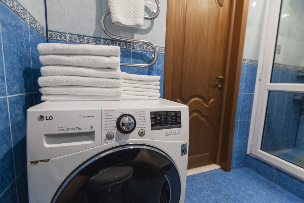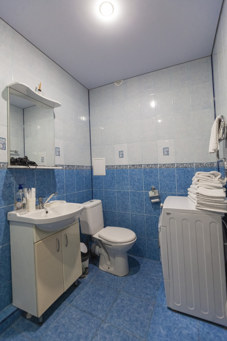 - Стильный санузел с душевой кабиной, раковиной, зеркалом, стиральной машиной и феном.