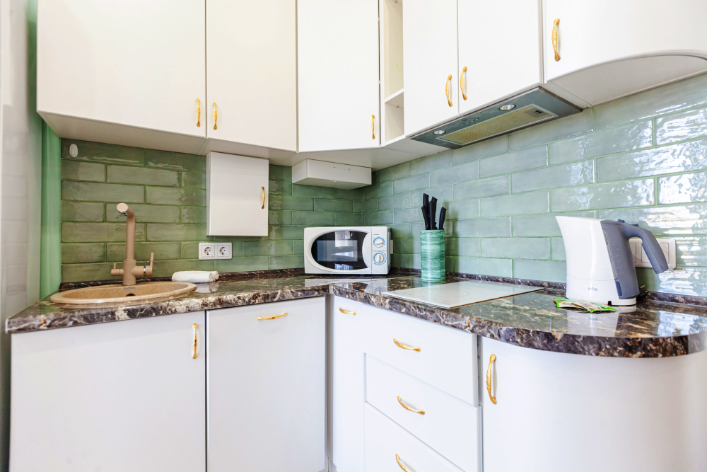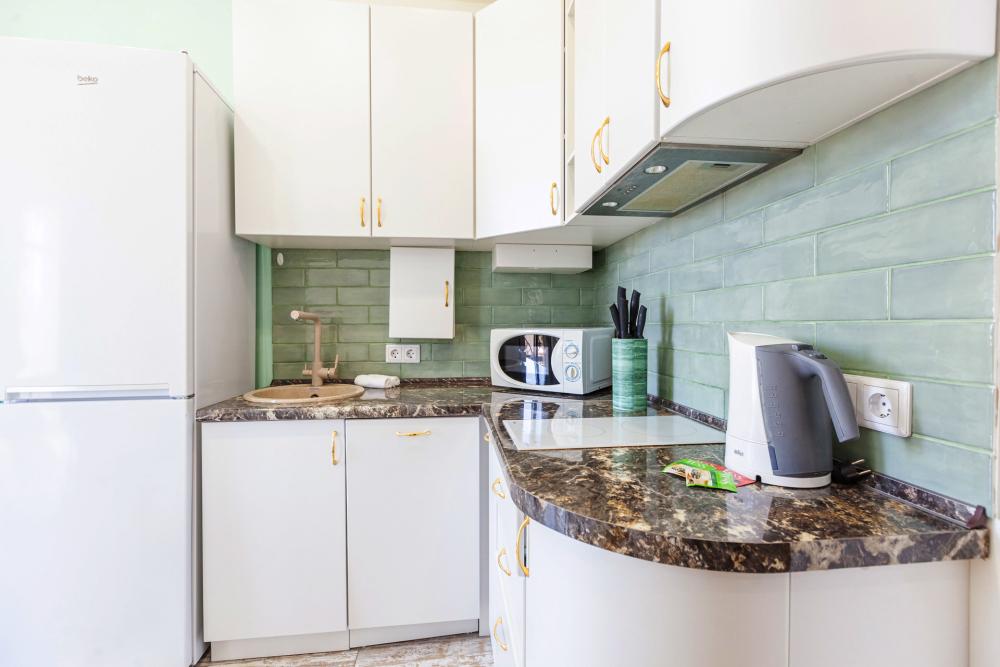 - Современная кухня, оснащенная индукционной плитой, холодильником, электрическим чайником и микроволновой печью, готова удовлетворить любые кулинарные предпочтения.