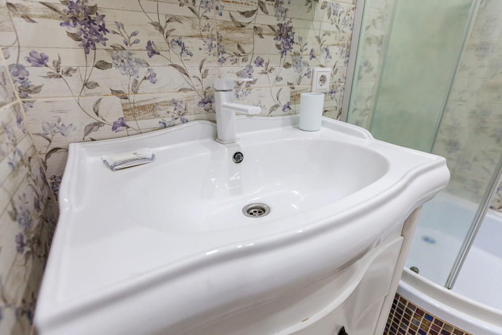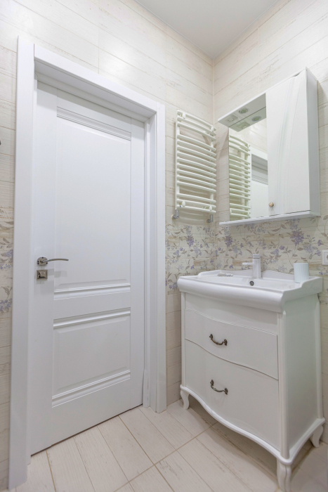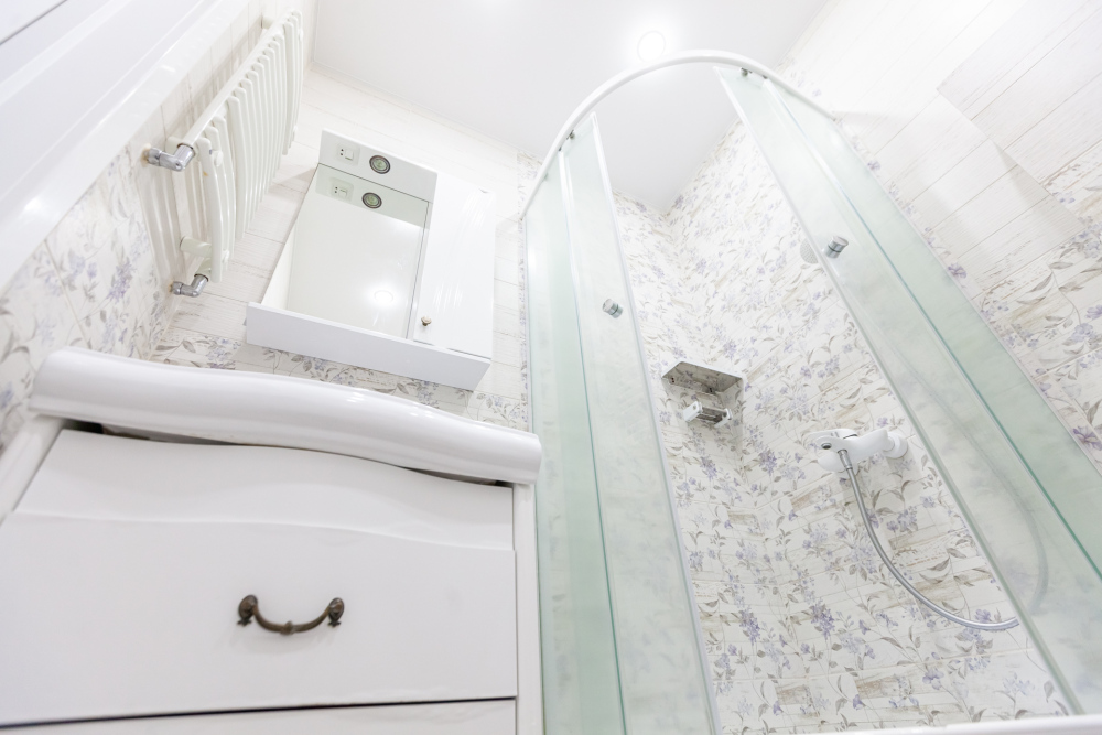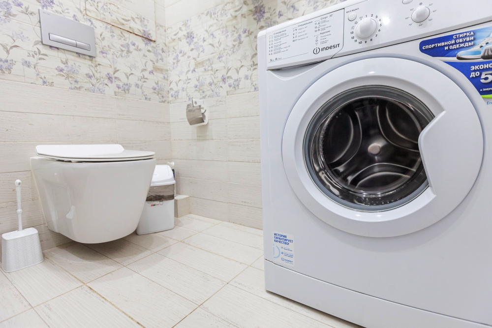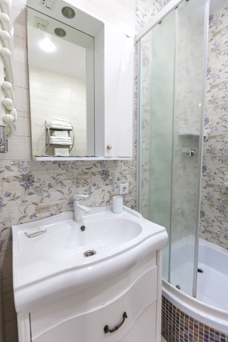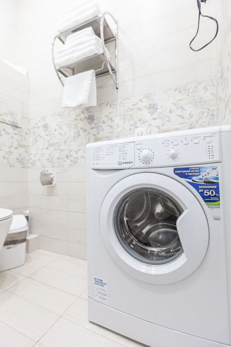 - Стильный санузел с душевой кабиной, раковиной, зеркалом, стиральной машиной и феном.