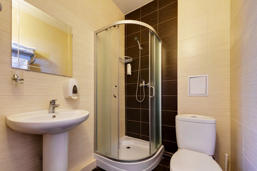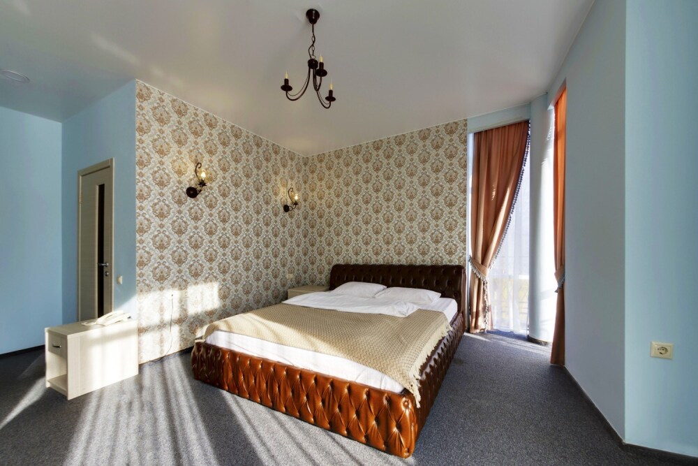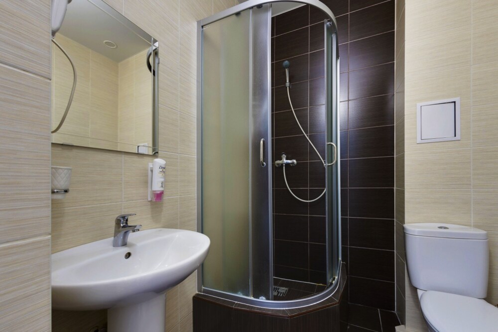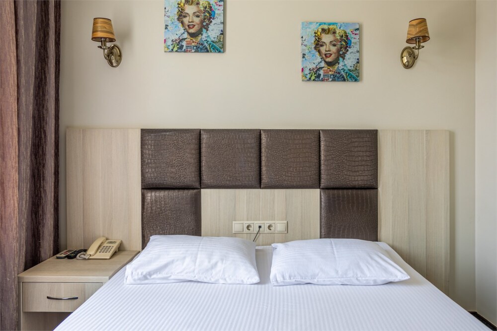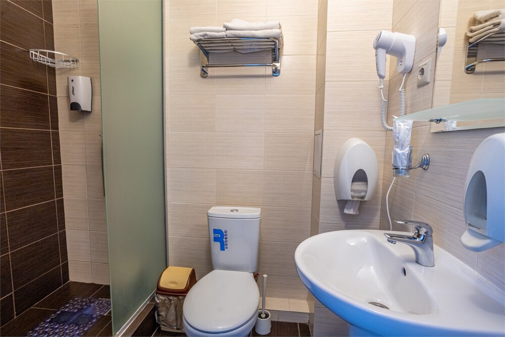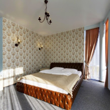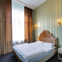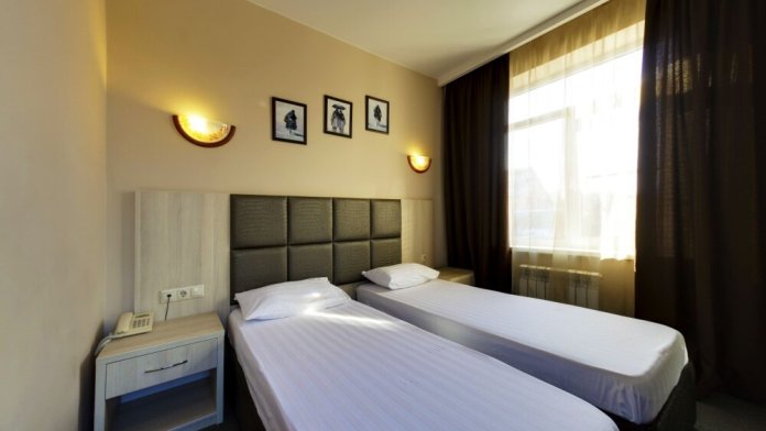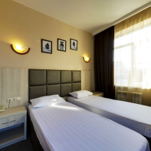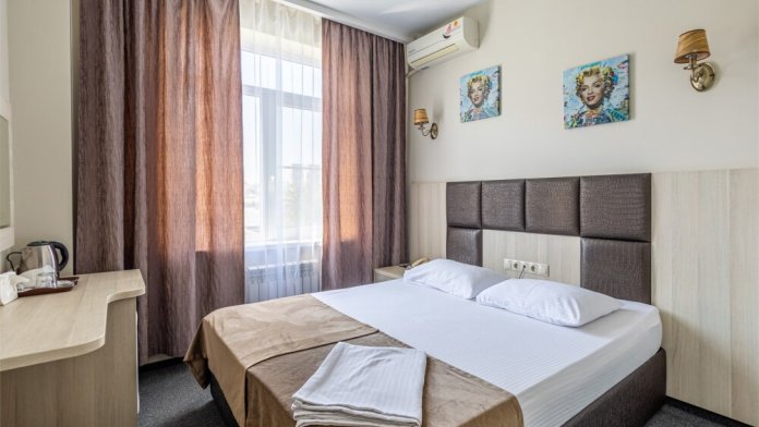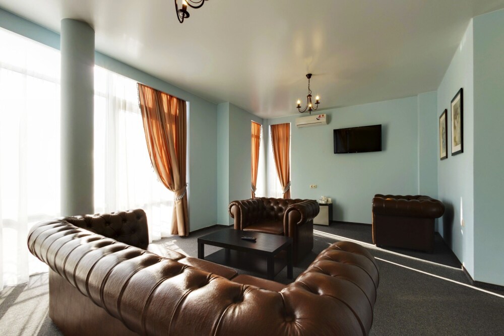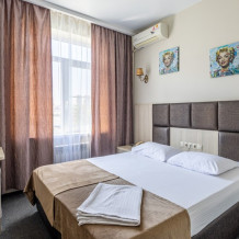 Номер с двумя смежными комнатами. В спальне находится двуспальная кровать, в гостиной раскладной 2-спальный диван. Номер рассчитан на проживание семьи с двумя-тремя детьми. В санузле: душ, раковина, унитаз.