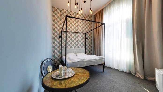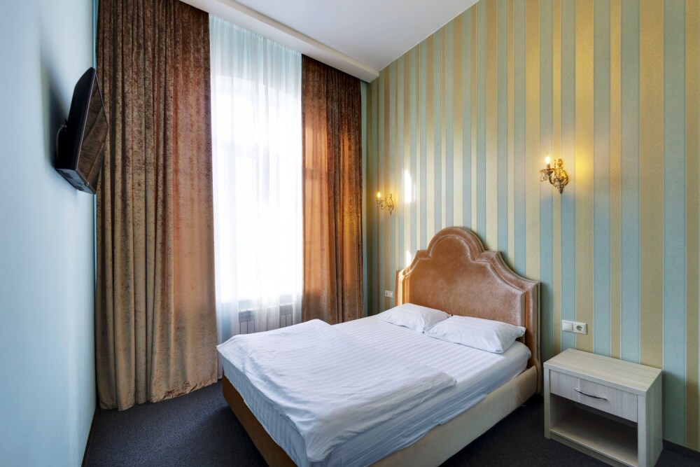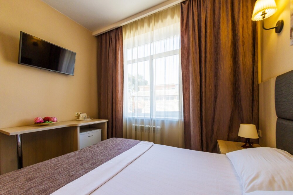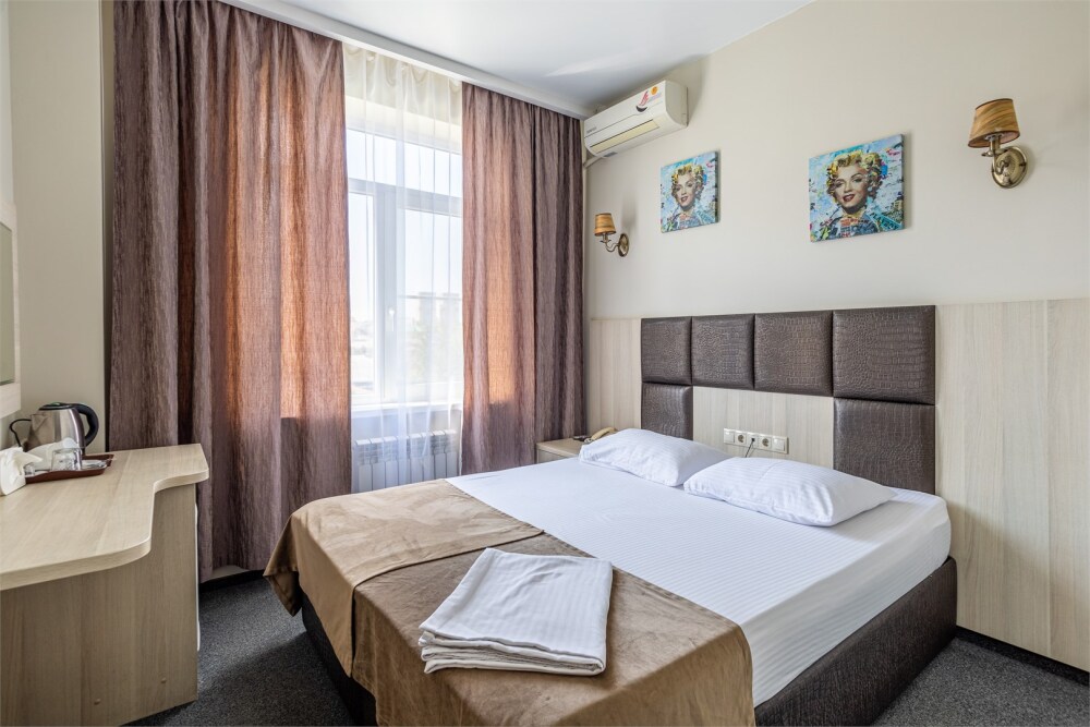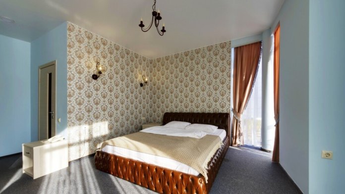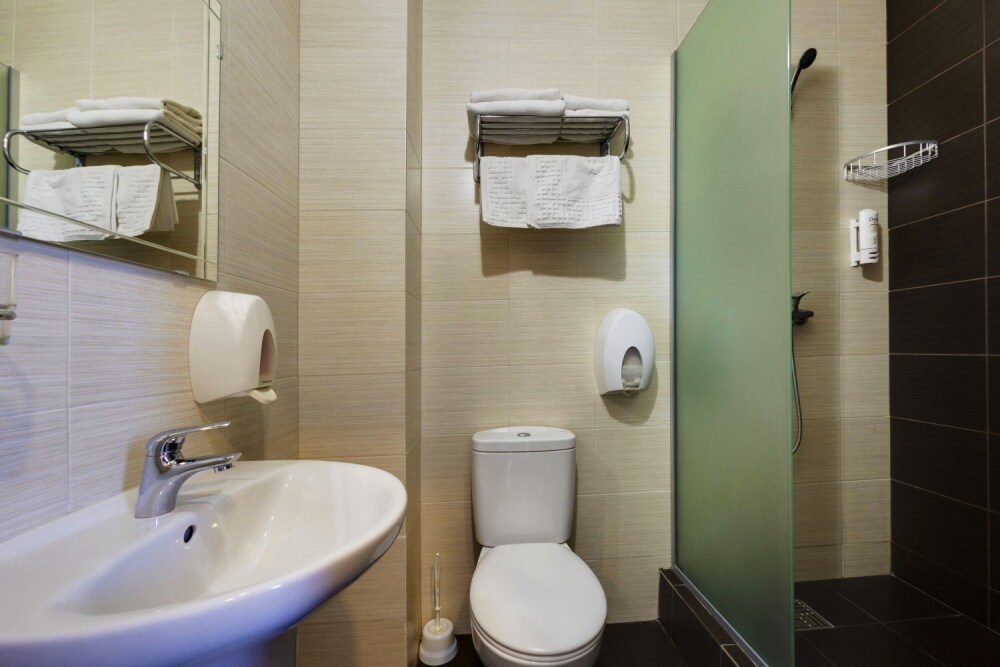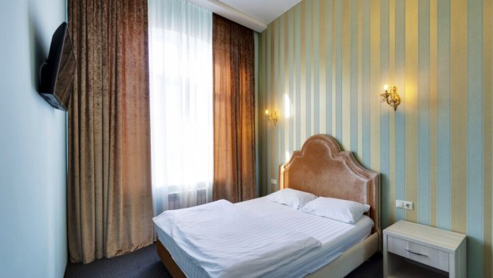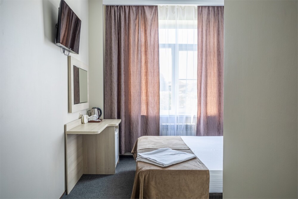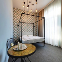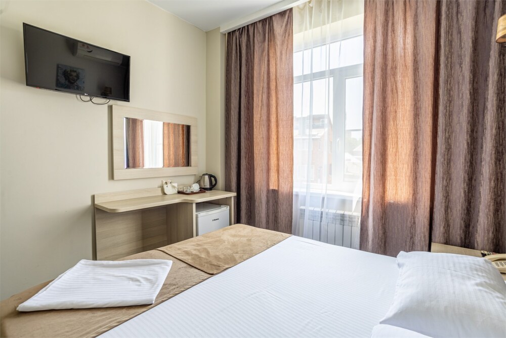 Номер с двумя смежными комнатами. В спальне находится двуспальная кровать, в гостиной раскладной 2-спальный диван. Номер рассчитан на проживание семьи с двумя-тремя детьми. В санузле: душ, раковина, унитаз.