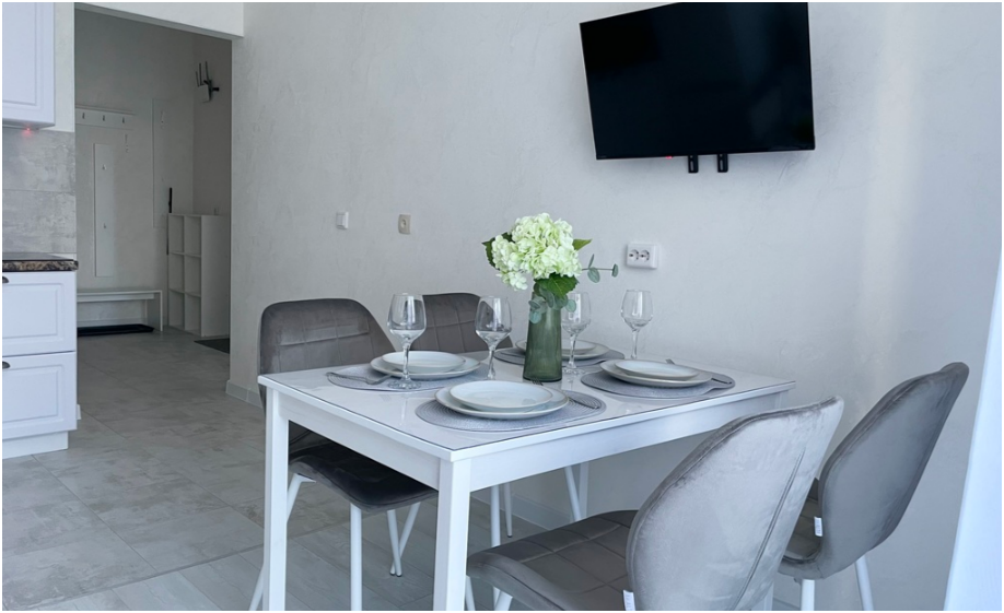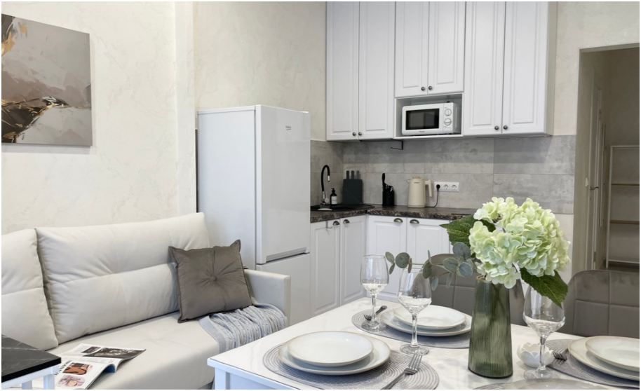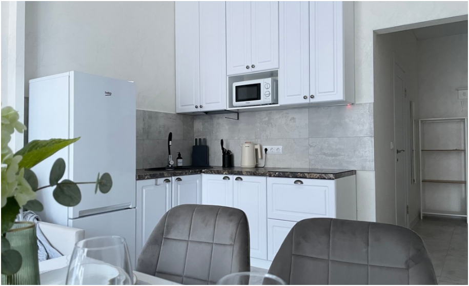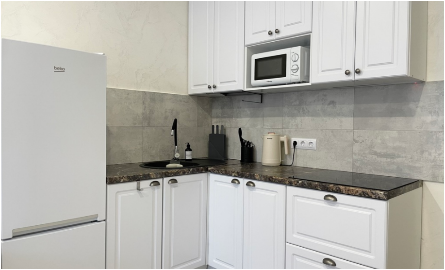 - Все необходимые кухонные принадлежности для комфортного приготовления еды (новая посуда, электрический чайник, плита, холодильник, микроволновая печь).