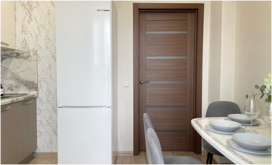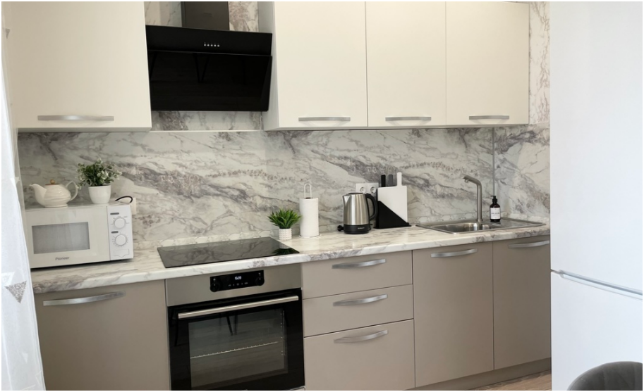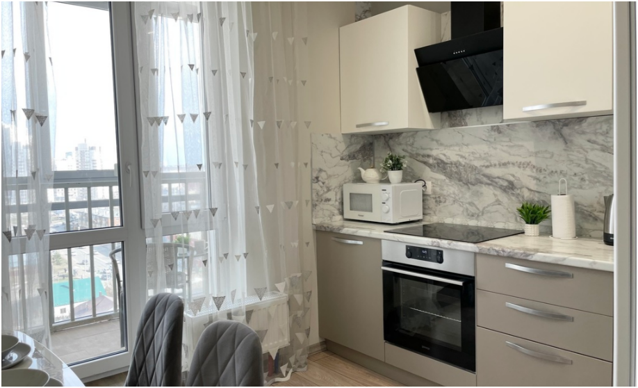 - Все необходимые кухонные принадлежности для комфортного приготовления еды (новая посуда, электрический чайник, плита, холодильник, микроволновая печь).