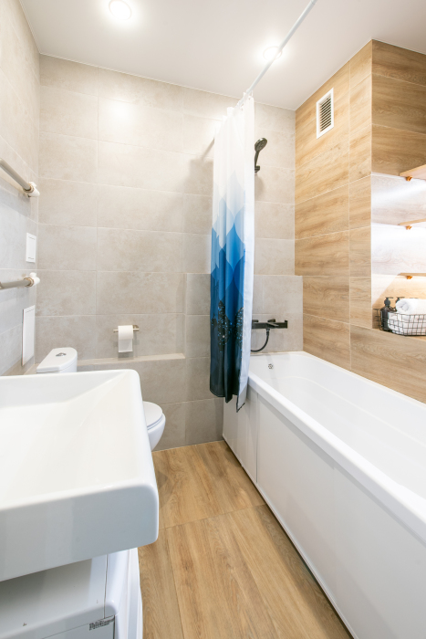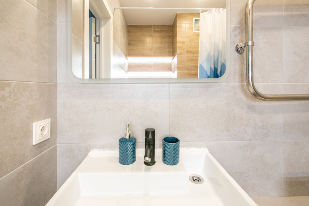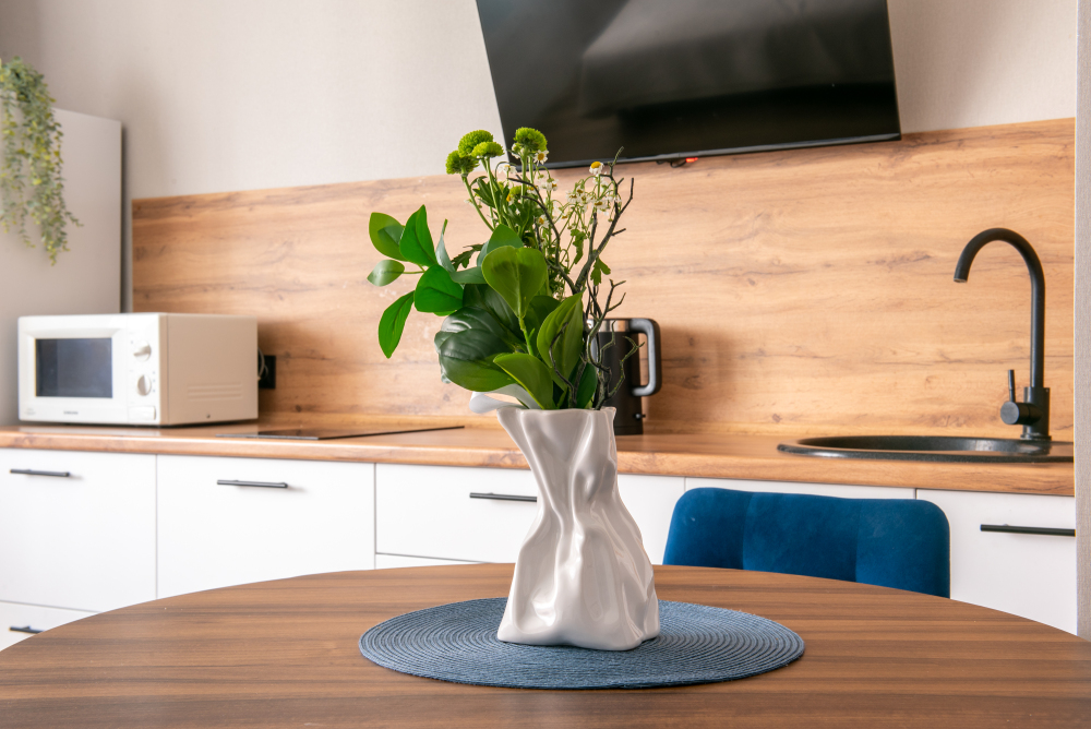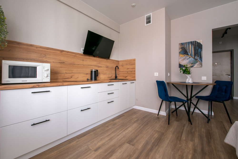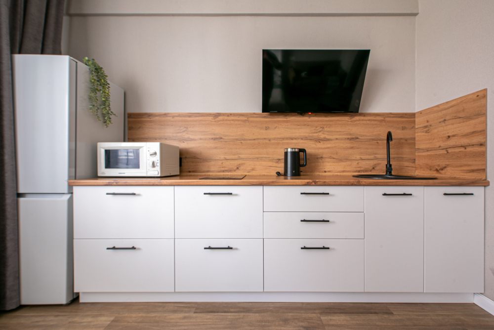 - Все необходимые кухонные принадлежности для комфортного приготовления еды (новая посуда, электрический чайник, плита, холодильник, микроволновая печь).