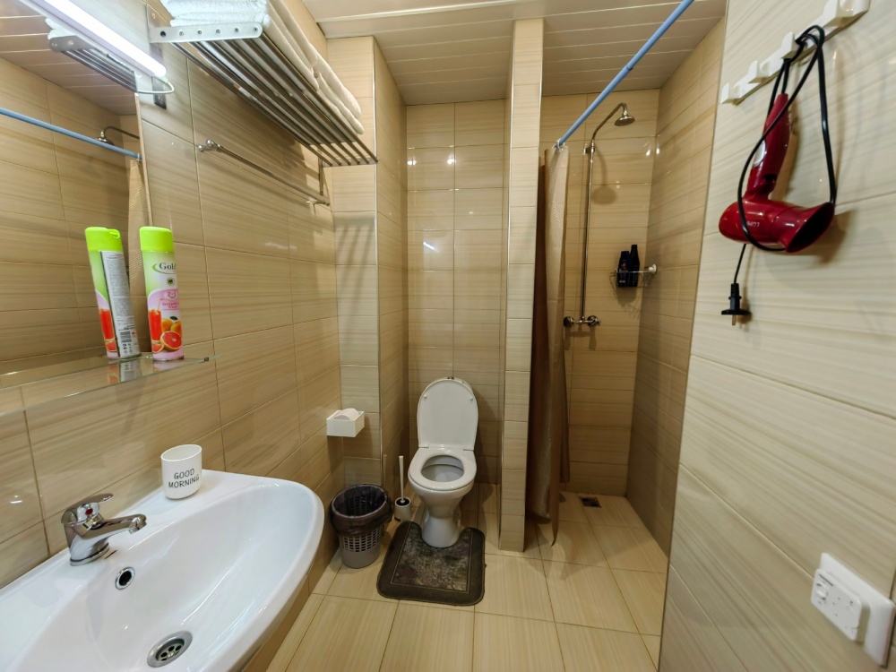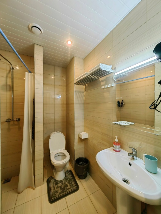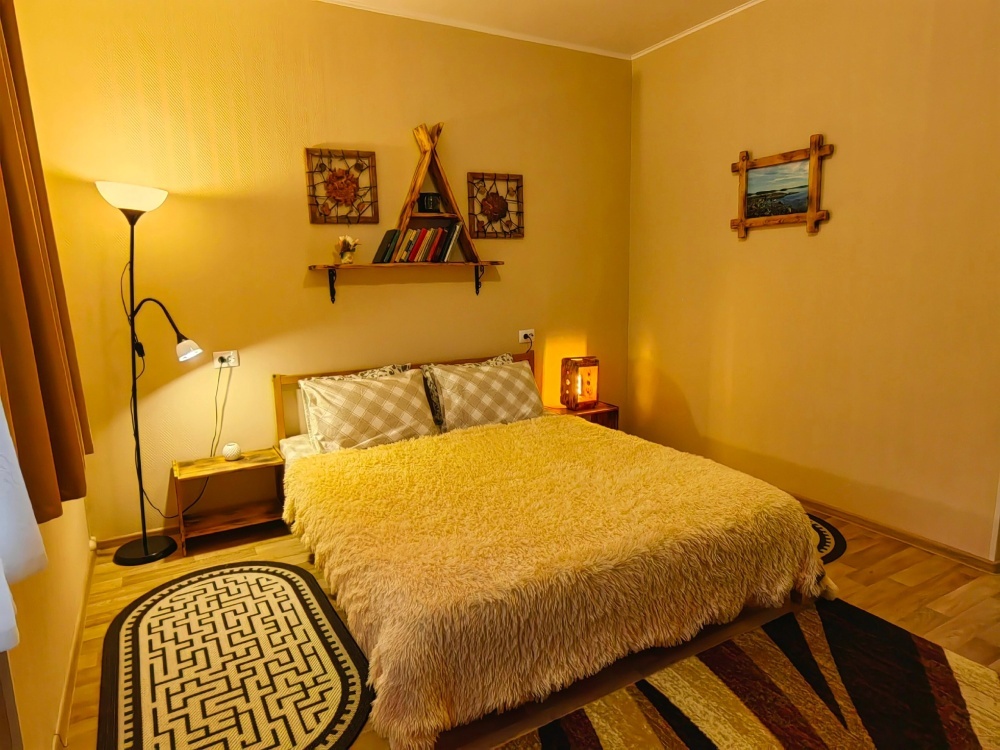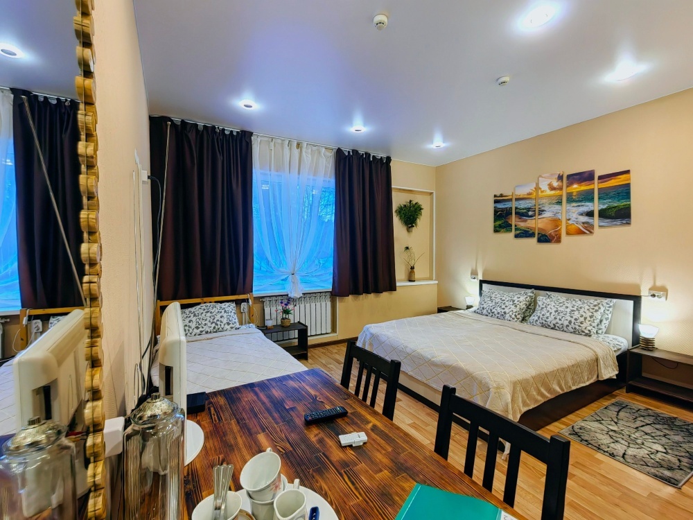 Двуспальная кровать с матрацем класса, большой телевизор, электрический чайник, туалетная комната с душевой, фен, махровые халаты, тапочки.