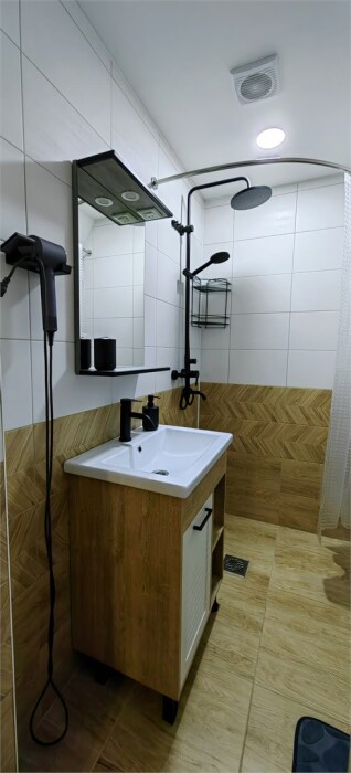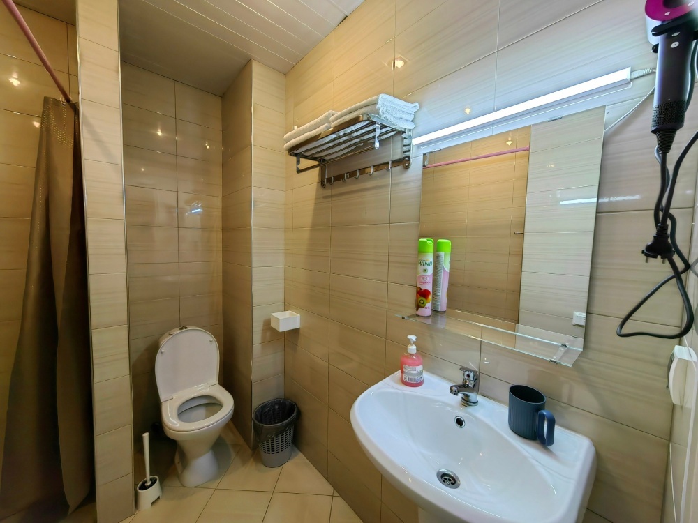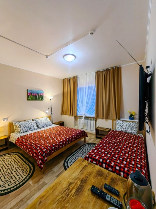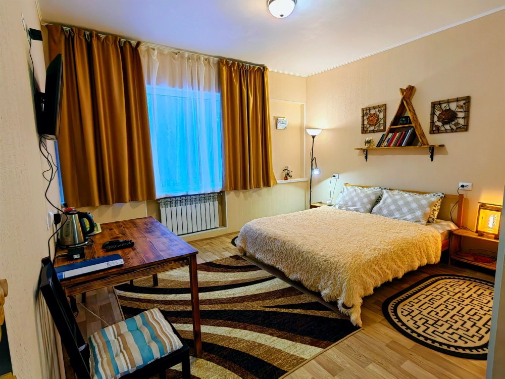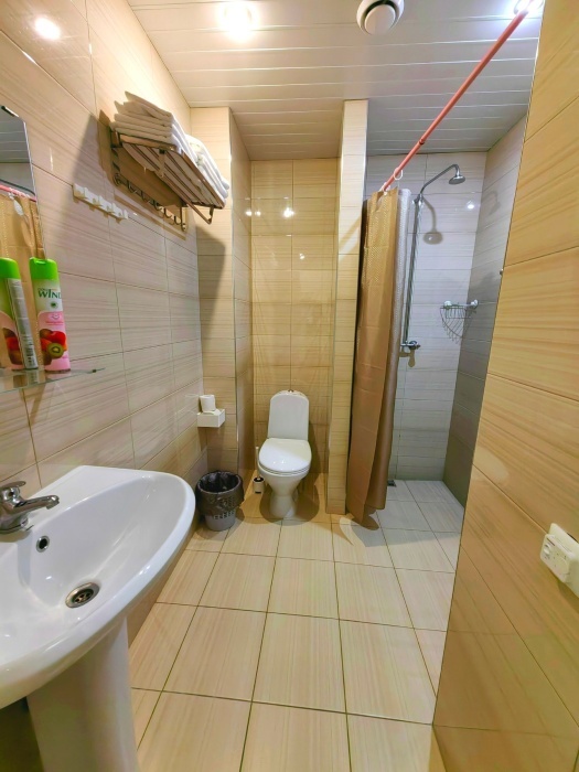 Двуспальная кровать 160х200, прикроватные тумбочки, телевизор, чайник, туалет, душ, махровые халаты, фен, тапочки.