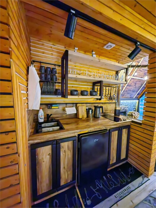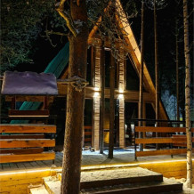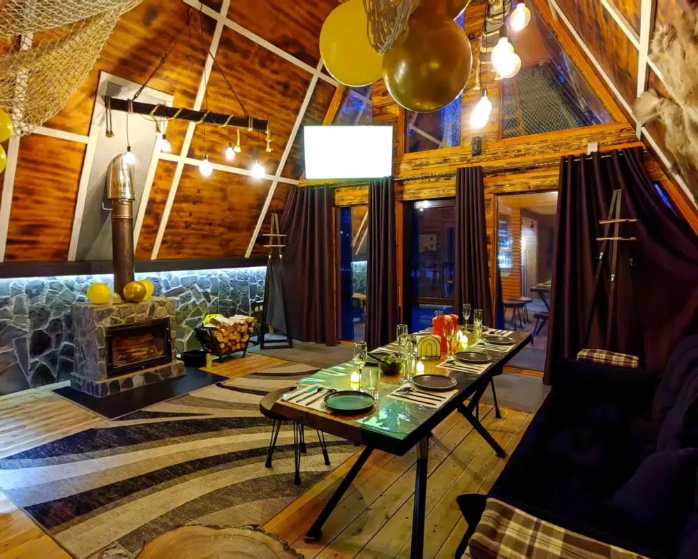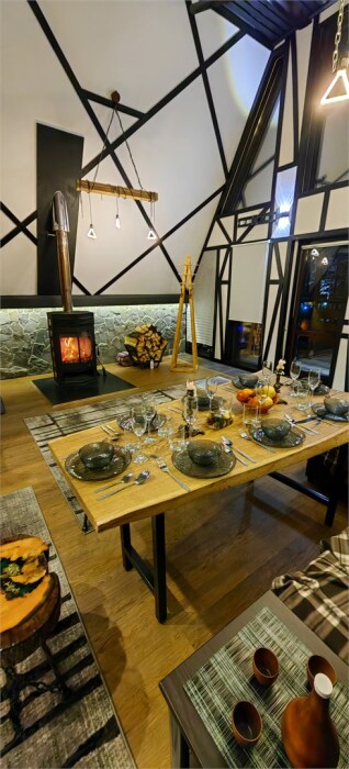 К Вашим услугам в гостинице базы отдыха расположен банкетный зал и кухня для самостоятельного приготовления и приема пищи, со всей необходимой техникой и посудой для сервировки стола. На территории базы отдыха, для гостей расположены мангальные зоны. А в каждом апартаменте (А-Frame-коттедже) находится кухня со всей необходимой техникой и посудой на 10 персон. Рядом с домом расположена мангальная зона, стол и скамейки.