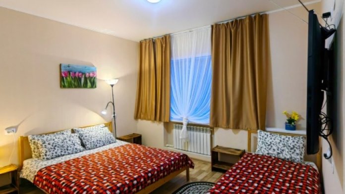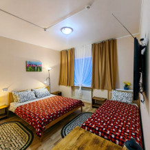 Одна 2-спальная кровать и односпальная кровать (или три односпальных кровати), прикроватные тумбочки, телевизор, чайник, туалет, душ, фен, тапочки.