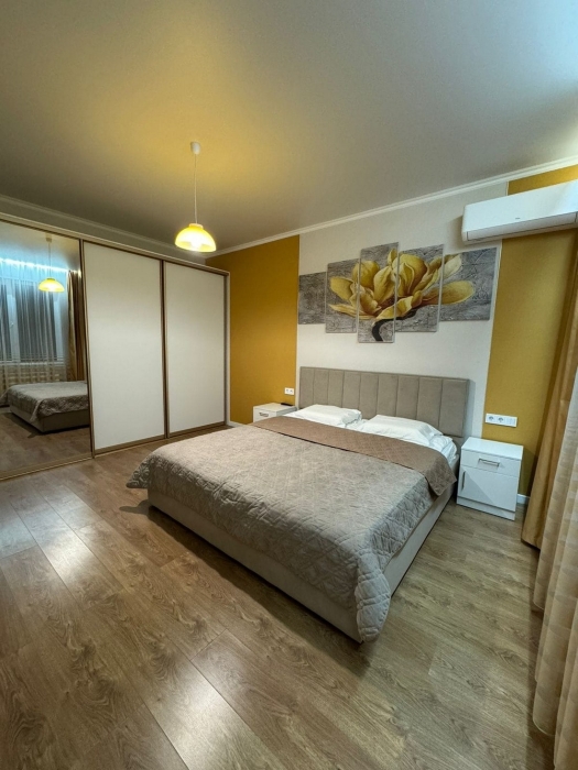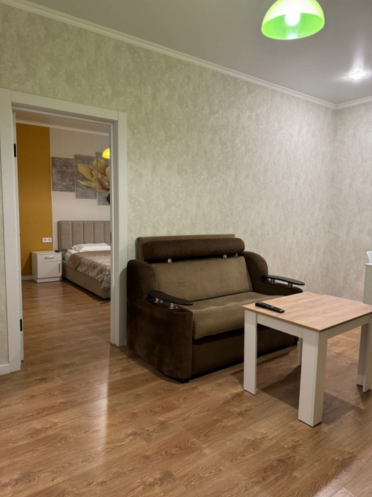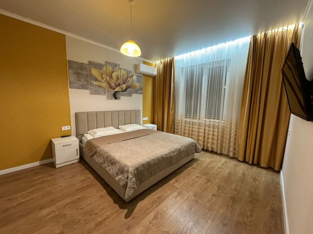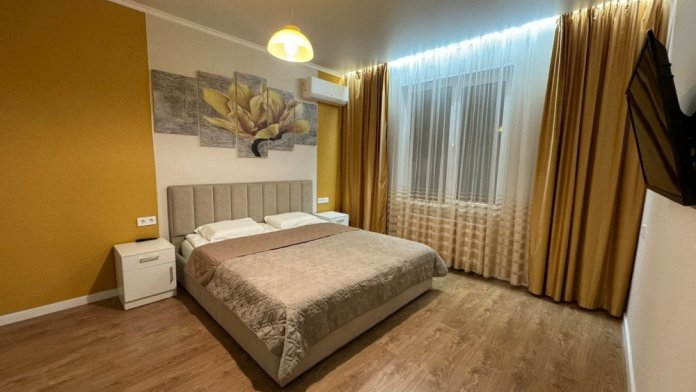 Имеется телевизор, кондиционер, чайник, отопление, шкаф, вешалка, журнальный столик, стулья, антимоскитная сетка и плотные шторы.