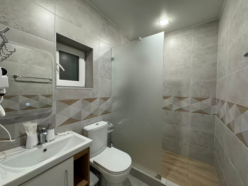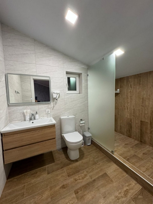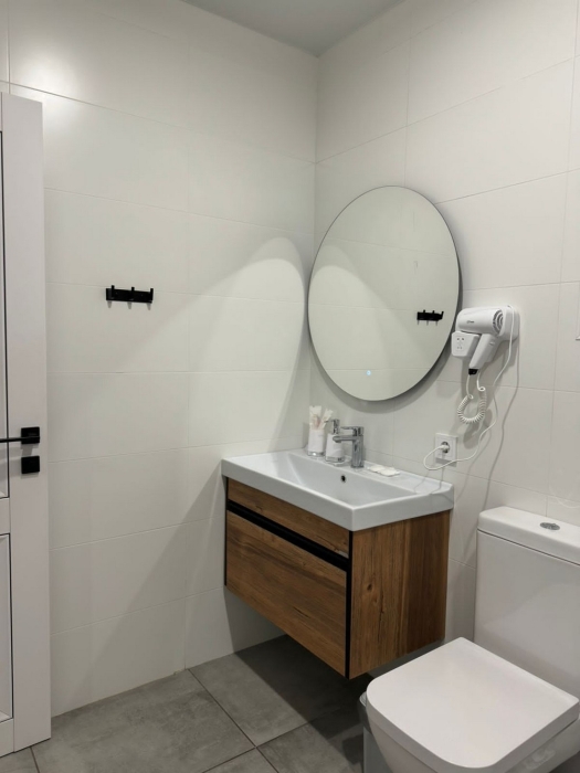 Индивидуальная ванная комната: душ, раковина, туалет.