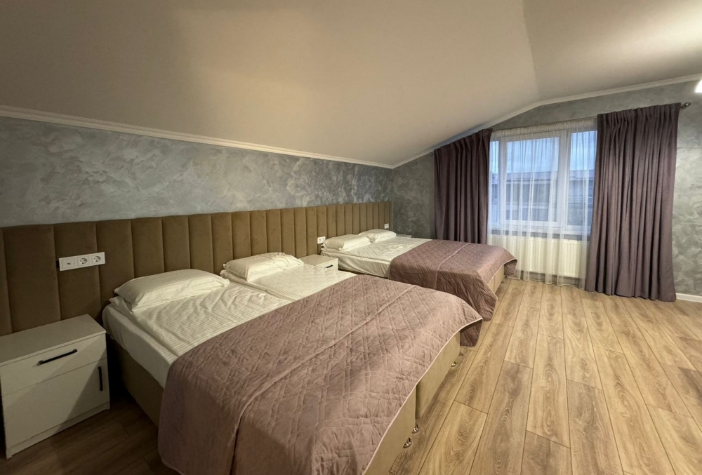 В номере: 2-двуспальные или 4-односпальные кровати, 1-диван двуспальный.