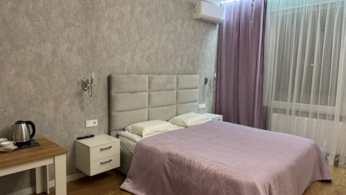 Имеется телевизор, кондиционер, фен, чайник, отопление, гардероб, вешалка, журнальный столик, туалетный столик, стулья, антимоскитная сетка и плотные шторы.