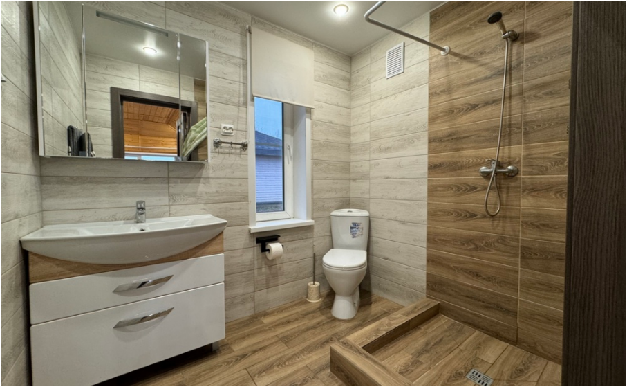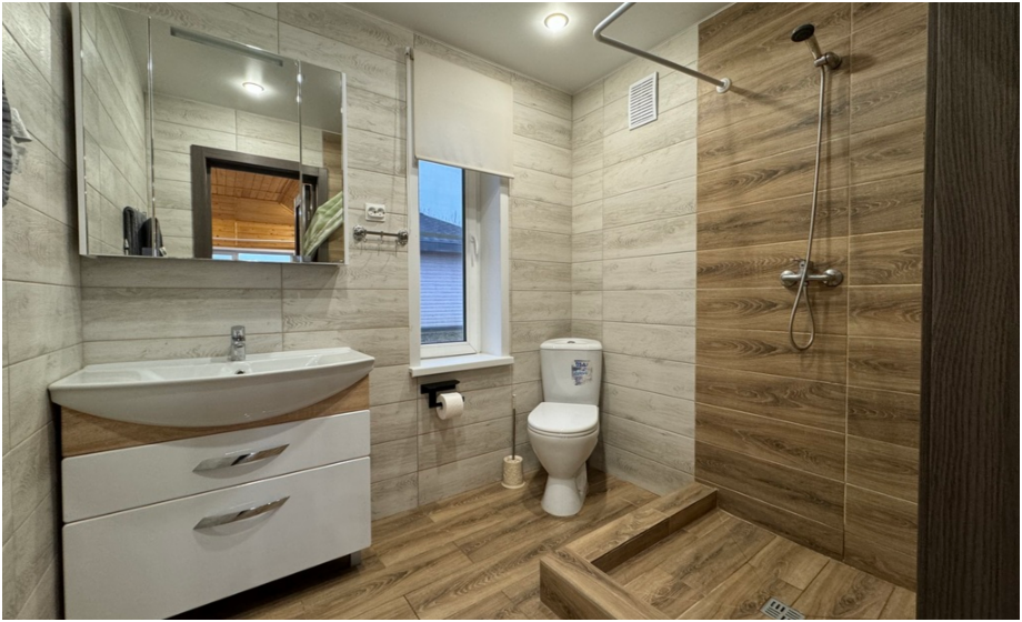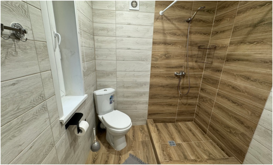 Душевая, туалет, раковина, средства гигиены и свежие полотенца.