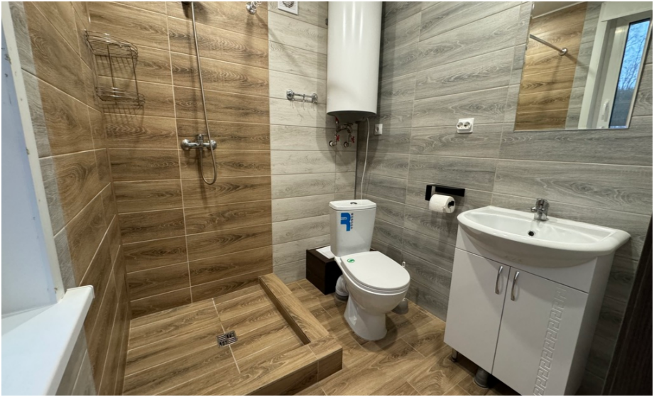 .Душевая, туалет, раковина, средства гигиены и свежие полотенца.